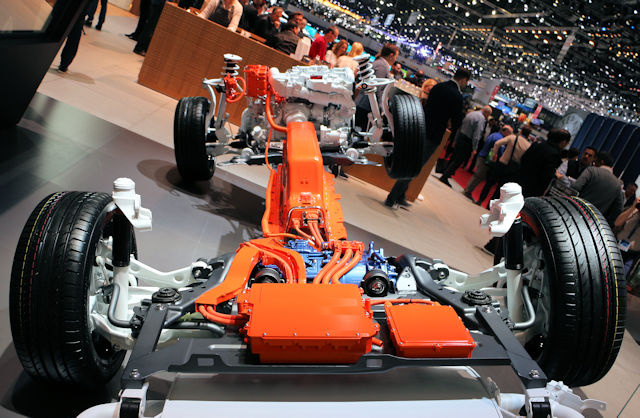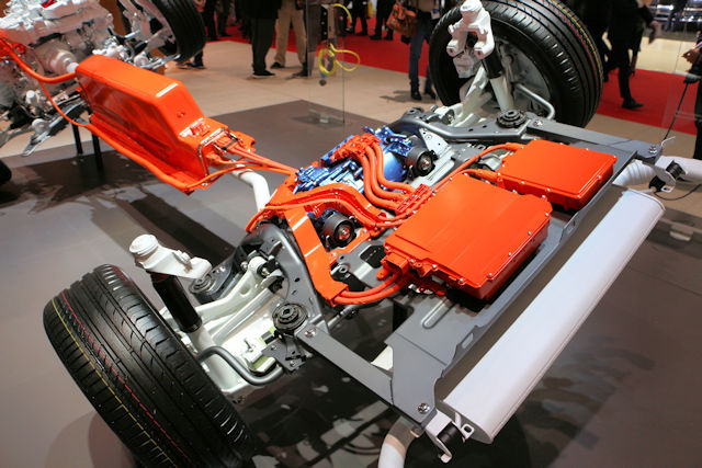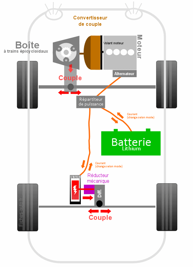 Ce fameux axe incorpore un moteur électrique (donc stator + rotor) connecté à une batterie logée au coeur de l'auto, avec à sa sortie un réducteur (boîte de vitesse 1 rapport en quelque sorte) puis enfin un différentiel pour partager la puissance en deux. C'est ce moteur qui va donc aussi récupérer l'énergie au freinage et à la décélération, le tout piloté par l'électronique de puissance qui gère les flux électriques (ce qui fait varier la résistance dans la rotation du rotor, et donc aussi sa production d'électricité).
