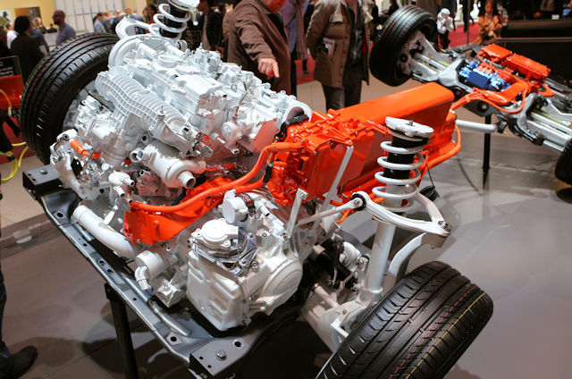Le moteur à l'avant travaille avec une boîte à convertisseur de couple et il est donc nécessaire que celle-ci se mette en neutre quand on circule en tout électrique. En effet, il ne faut pas que le moteur thermique ne vienne provoquer une résistance dans la traction électrique faite par l'arrière. Je n'ai hélas pas plus de détails sachant que les informations sur les dispositifs d'hybridations sont rares (surtout sur les détails techniques de fonctionnement)... En tout cas aucun embrayage multidisque n'a été signalé pour déconnecter le moteur thermique de la transmission.