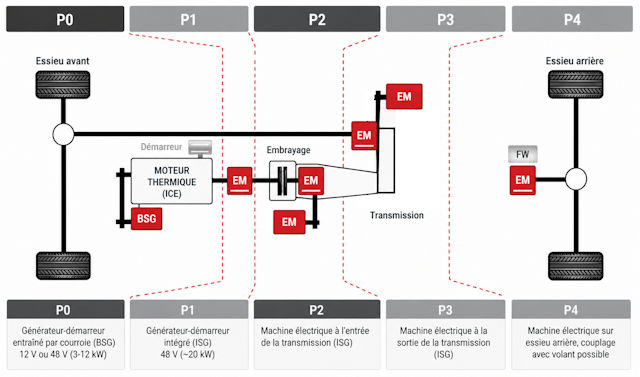 Les voitures hybrides utilisent des architectures très différentes, et c'est justement ce qui rend le sujet un peu complexe, même pour les connaisseurs, car les combinaisons techniques se multiplient vite. Deux modèles peuvent être vendus comme “hybrides” tout en ayant une chaîne de traction très différente dans les faits. Pour y voir plus clair, l'industrie utilise souvent une nomenclature assez simple avec la lettre P, pour position, suivie d'un chiffre allant de P0 à P4. Il ne s'agit pas vraiment d'une norme réglementaire officielle, mais plutôt d'une classification technique très répandue chez les équipementiers, les ingénieurs et dans les documents spécialisés. Ce classement indique tout bêtement la position du moteur électrique dans la chaîne de traction, depuis le simple alterno-démarreur relié au thermique jusqu'au moteur électrique placé sur un essieu séparé. Voyons donc les principales architectures hybrides du marché, car cette lecture permet de comprendre assez vite si l'on parle d'une simple assistance électrique ou d'un vrai système capable de rouler sans moteur thermique.