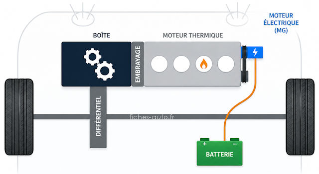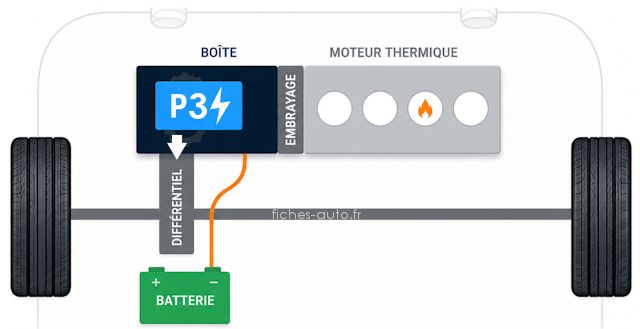 Le P3 est placé plus loin dans la chaîne cinématique, côté sortie de boîte (souvent à l'intérieur même), généralement avant le différentiel ou directement lié à la réduction finale. C'est donc lui qui prend le rôle de moteur de traction dans beaucoup d'architectures hybrides modernes, surtout quand il est associé à un P1 qui sert de générateur. Cette disposition permet de faire avancer la voiture en électrique sans demander au moteur thermique de tourner, à condition que l'architecture de la boîte le permette. En gros, dans un montage P1 + P3, le P1 fabrique ou récupère l'énergie côté thermique, tandis que le P3 applique le couple côté roues. C'est pour ça que cette architecture est très utilisée dans les transmissions hybrides dédiées, car elle sépare assez proprement la fonction génératrice et la fonction traction.