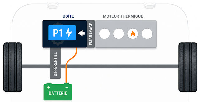 Le P1 est souvent mal compris, car il ne faut pas le voir comme un simple alternateur amélioré ni comme un vrai moteur de traction indépendant. Dans cette architecture, la machine électrique est placée côté moteur thermique, en amont de la transmission ou intégrée dans la boîte avec une liaison mécanique vers le moteur. Elle est donc avant tout liée au régime du thermique, ce qui la rend très pertinente pour démarrer le moteur, récupérer de l'énergie et produire du courant. Dans les systèmes hybrides modernes de type P1 + P3 (E-Tech quasiment toutes les boîtes électrifiées qui ont en général deux moteurs internes), le P1 joue souvent le rôle de générateur, entraîné par le moteur thermique via le vilebrequin ou via des engrenages internes à la boîte. En revanche, comme il reste fonctionnellement du côté thermique, il n'est pas la machine principale qui propulse seule la voiture.