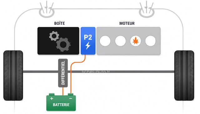 Donc en théorie, même si cette position est officiellement indiquée comme étant connectée au vilebrequin, avant même l'embrayage/convertisseur (lien moteur/boîte), on remarque dans les faits qu'il n'y a pas vraiment de cas où on voit un moteur électrique lié au volant moteur (sauf démarreur de voiture classique ...). C'est souvent intégré dans la boîte même, à savoir que le moteur électrique est lié aux arbres et rouages en lien avec le moteur avant tout.