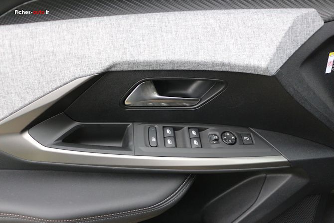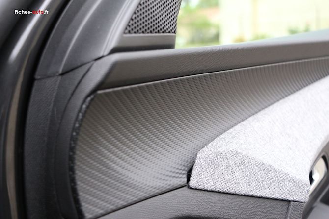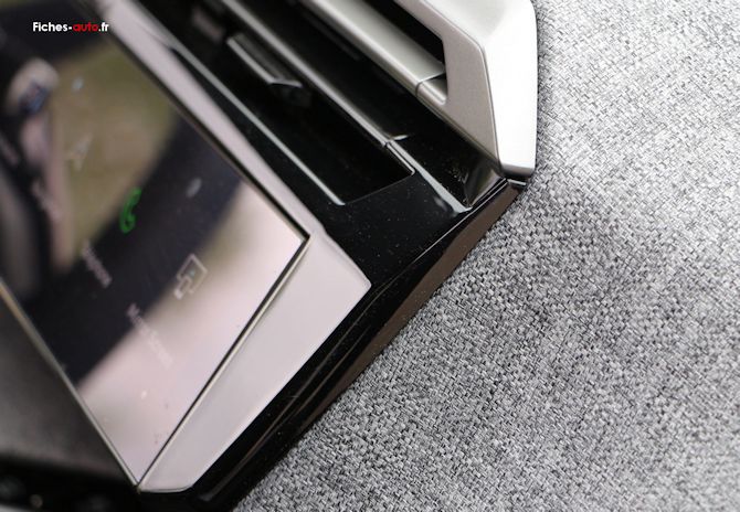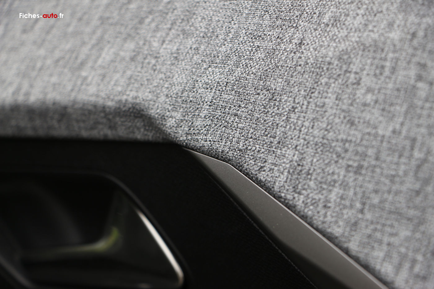 Les matériaux "sont très Peugeot" (on reconnaît toute de suite les plastiques usuels qu'on retrouve sur le reste de la gamme) et on a donc du mal à ressentir l'ambiance d'une voiture premium (le cerveau n'y arrive pas me concernant) bien que les assemblages soient très corrects (surtout vis àvis de l'ancien). C'est donc bariolé de partout au niveau de la présentation pour compenser ces matière assez quelconques, mais au final ça reste une Peugeot classique (avec le sentiment que ça sonne creux et des plastiques durs nombreux). Le tissus gris amène un peu d'originalité mais ça reste finalement terne et pas forcément très chic (j'ai pour ma part peur des tâches au fil du temps), et on aurait aimé d'autres choix pour couvrir cette planche de bord, qui tire décidément trop vers le gris ...