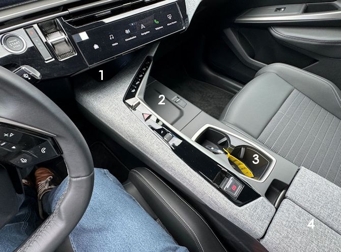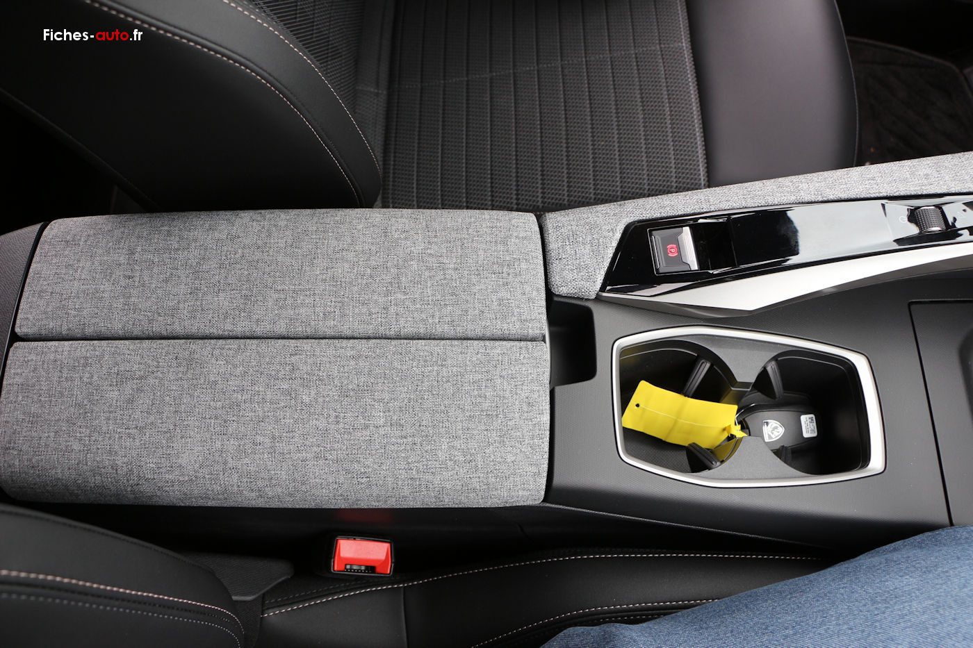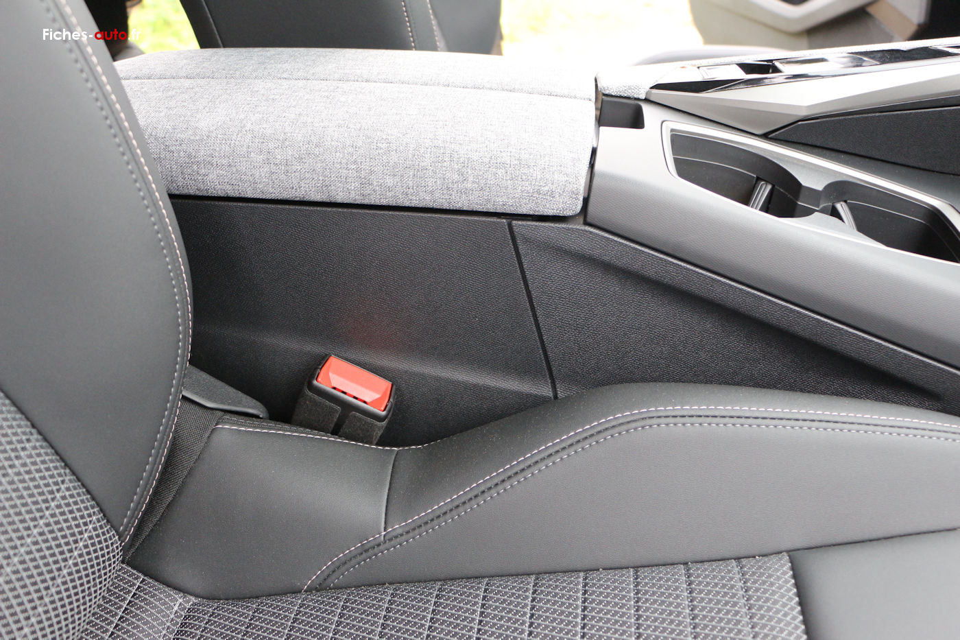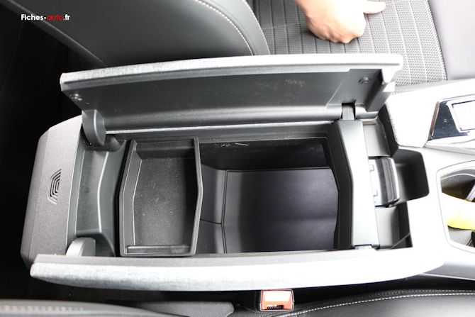 Pour finir on a le bon vieux accoudoir qui s'ouvre en deux parties et dont le fond continue vers l'avant (il y a même la forme du bras pour aller chercher des choses et pouvoir bien rentrer son membre dedans, bien que cette expression en aura peut-être intrigués certains ! Je voulais éviter la répétition du mot bras). Pour ma part j'accorde de moins en moins d'importance à l'accoudoir car en conduite il est moins accessible que les rangements situés plus en avant. Et y prendre et y déposer des objets est plus contraignant car il faut se contorsionner un peu, ce qui n'est pas le cas vers l'avant (j'ai personnellement une tesla, je me suis donc habitué à avoir des rangements vastes et très accessibles).