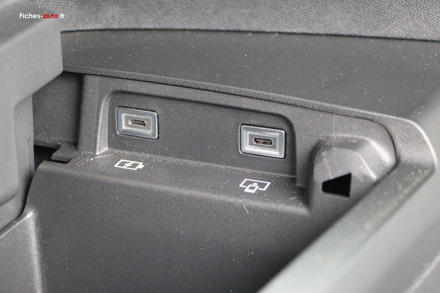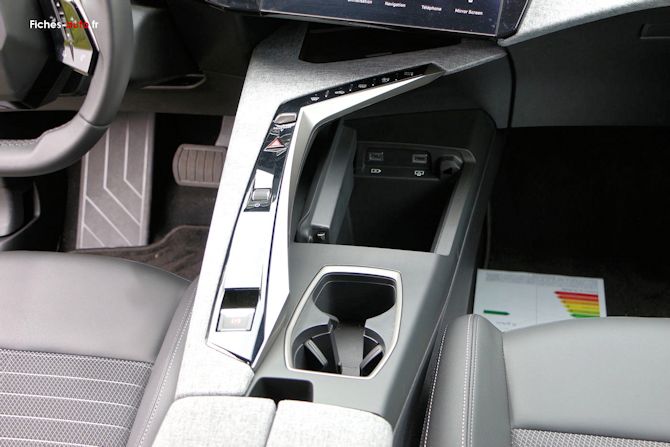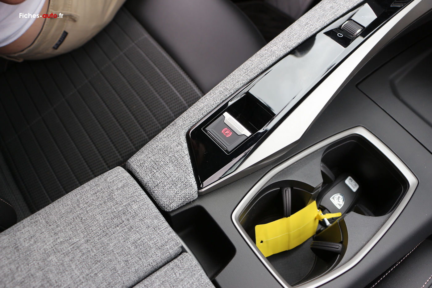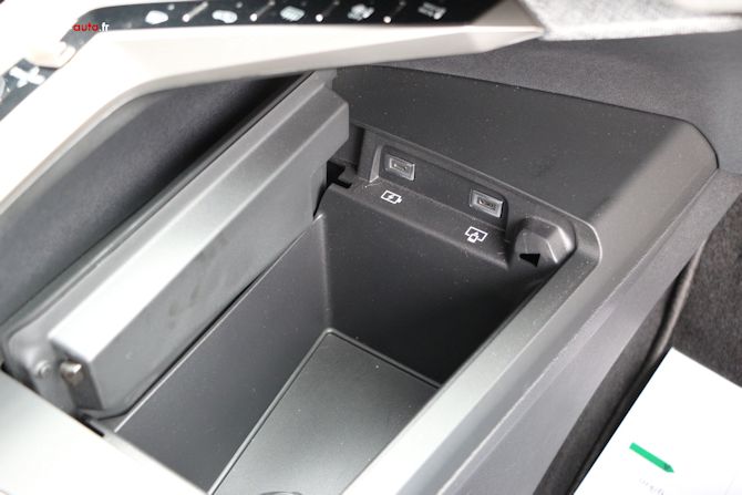 On a donc à l'avant un rangement en hauteur qui est destiné à accueillir un téléphone, cela en raison de la charge par induction dont il devient difficile de se passer. On regrettera toutefois l'impossibilité de consulter le téléphone pendant qu'il charge, ne serait-ce que pour jeter un coup d'oeil (volonté de Peugeot de vous dissuader de le regarder en conduisant ?). On aura alors vite tendance à l'oublier dans la voiture, car il est finalement assez dissimulé.