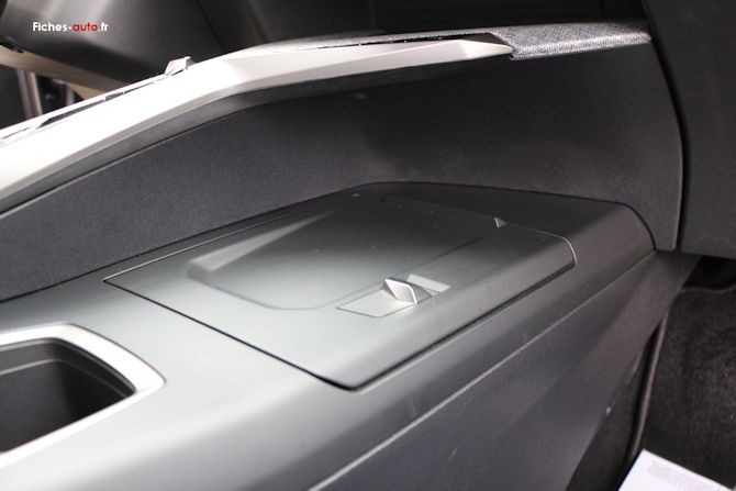 En dessous de cet "étage", on a sur la droite un espace de rangement avec couvercle dont la forme du dessus incite le passager à y installer son téléphone ou son portefeuille (mauvaise idée, le plastique va vite se rayer et dans les virages pris avec trop d'entrain ça va tomber). Ce rangement à première vue très pratique se situe mal pour le conducteur, on a en effet la très haute console centrale qui vient gêner. Et même si ça n'empêche pas son accès, on se sent loin et parasité par cette barrière formée par la console centrale, c'est donc peu agréable.