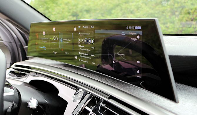 La disposition des écrans, qui seraient finalement une seule et même dalle, induit un écran multimédia principal trop modeste en terme de diagonale. En effet, ce n'est pas avec ça qu'on va regarder une vidéo ou naviguer sur internet avec efficacité, et de toute manière le dispositif ne le permet pas. L'écran central est bel et bien tactile mais il nécessite de se pencher un peu en avant pour y accéder, il ne tombe pas parfaitement sous la main. Quant à l'effet flottant des écrans, on ne le remarque finalement pas beaucoup depuis le poste de conduite, et ce contrairement aux images de présentation officielles.