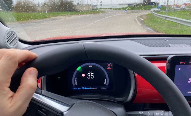 De plus la puissance est délivrée trop tranquillement pour pouvoir profiter du punch naturel de l'électrique, cela est semble-t-il (je dirais même que c'est certain) lié à l'ASR (contrôle de traction) qui évite que le train avant ne devienne trop sauvage (ce qui est le cas sur une Renault électrique par exemple, et pour ma part je préfère le choix du losange qui nous laisse le choix de pouvoir avoir des accélérations brutales quitte à perdre en motricité). Ici c'est un peu trop endormi ...