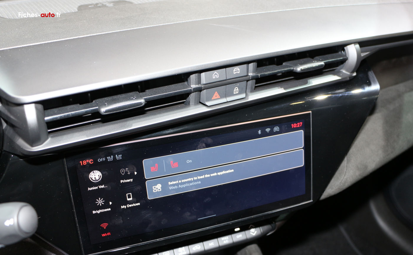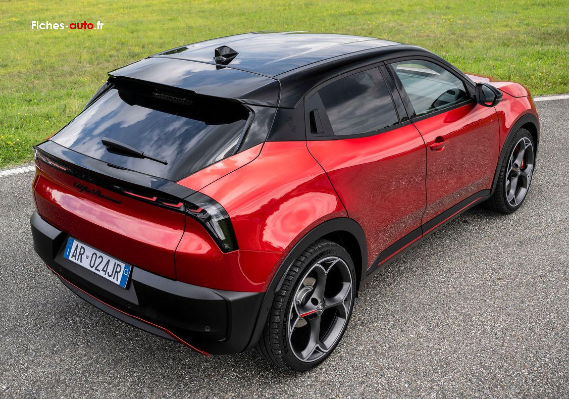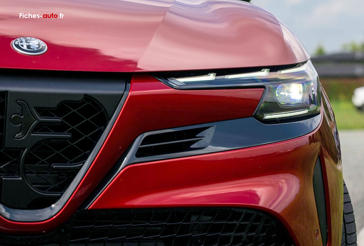 (Source Alfa Romeo Mars 2025) A partir de 29 500 euros : Projecteurs Full-Led avec signature lumineuse // Apple Carplay et Android Auto sans fil // Alfa Connect Services // Vitres avant et arrière électriques // Prise avant USB type A + C (Charge et données) // Système audio à 4 haut-parleurs // Radio DAB // Combiné d’instruments digital 10,25” Cannochiale // Système d’info-divertissement 10,25” tactile // (1) Chargeur embarqué 7 kW // (1) Câble de recharge Type 2 Mode 3 // Accoudoir avant // Volant multifonction en matériaux synthétiques // (2) Palette au volant // Freinage d’urgence autonome urbain (détection des usagers vulnérables) // Assistant d’aide au maintien dans la voie // Sélecteur de mode de conduite DNA (3 modes) // 6 airbags (frontaux, latéraux et rideaux) // Détection de fatigue du conducteur // Alerte de rappel de présence sur les sièges arrière // Capteur de pression des pneumatiques TPMS // Alerte de collision avant // Radars de stationnement arrière // Régulateur de vitesse adaptatif intelligent avec lecture des panneaux // Rétroviseurs extérieurs réglables électriquement // Frein de parking électrique // Allumage automatique des feux et des essuie-glaces // Climatisation automatique mono-zone // Système de démarrage sans clé // Banquette arrière rabattable 60/40 // Sièges avant réglables manuellement // Coques de rétroviseurs noir brillant // Feux arrière Full-Led // Scudetto Leggenda