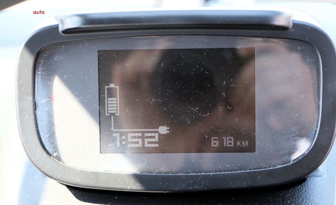 C'est donc tout simple, on a ici une batterie de 5.5 kWh utiles (5.8 kWh bruts) qui se charge uniquement par une prise de courant classique, inédit sur les voitures électriques ! L'auto a donc un câble qu'on ne peut pas retirer et qui est la seule manière de la recharger. Avec une vitesse de 1.8 kW de puissance, la charge se fait en quasiment 3h (c'est même le temps maxi si vous êtes à 0%).