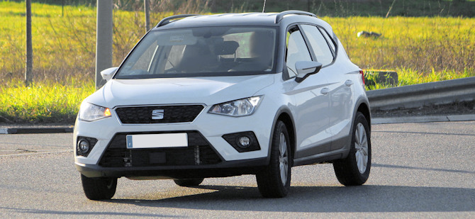 C'est donc un petit SUV basé sur un châssis de citadine (MQB-A0), son moteur transversal envoie logiquement la puissance aux roues avant. Le poids varie de 1180 kg à 1303 kg (PTAC avec conducteur et fluides), avec comme précisé plus haut un arrière léger en raison d'un semi-rigide (le déséquilibre des masses est donc plus favorisé sur les versions diesel : surpoids un peu plus important à l'avant). La monte pneumatique reste dans une bonne moyenne mais il n'y a rien ici qui puisse permettre d'obtenir un grip haute performance, mais il n'y a toutefois pas de carence vis à vis de la concurrence. On débute donc avec du 16 pouces à flancs assez hauts (roulis bien perceptible) et on culmine avec du 18 pouces à flancs bas qui permettent ici de révéler le châssis de l'Arona (généralement associé au châssis FR). Ils engendrent cependant et logiquement un confort plus heurté. Mais c'est la seule monte qui permet de commencer à s'amuser sur la route.