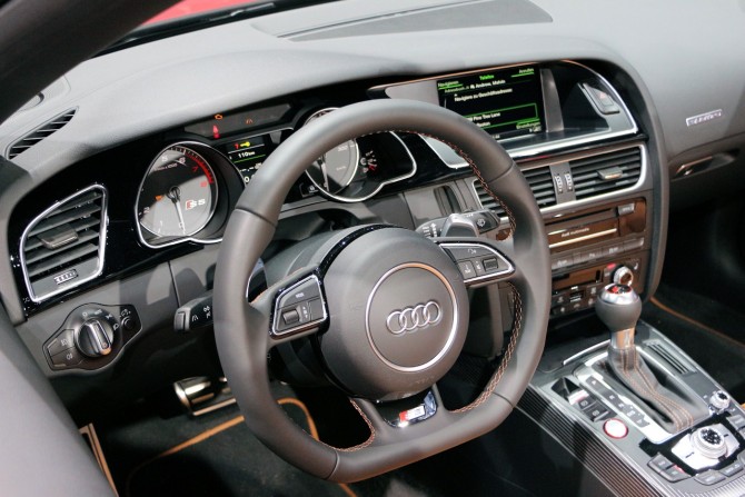A partir de 42 840 euros : GPS plus : système de navigation GPS de troisième génération avec DVD Europe, 2 lecteurs de cartes SDHC (jusqu’à 32 Go) compatibles MP3 / WMA / AAC et prise d’entrée AUX-IN. Code [PNW] à saisir par défaut pour Business line et S line // Sièges avant Sport // Applications décoratives en aluminium brossé mat // Châssis Sport avec amortissement plus ferme, suspensions renforcées // Ciel de pavillon en tissu noir // Climatisation automatique Confort plus 3 zones à fonctionnalités étendues et affichage numérique // Inscriptions S line sur ailes avant et seuils de portes // Jantes Audi Sport en aluminium coulé style 5 branches "Rotor", finition titane, polies, 9 J x 19", avec pneus 255/35 R 19 // Pack éclairage // Pack extérieur S line // Pommeau de levier de vitesses en cuir perforé, surpiqûres de soufflet de levier de vitesses argent // Sellerie mixte cuir/Alcantara perforé Sprint avec logo S line sur le dossier des sièges avant ; parties latérales d’assise et de dossier, appuie-tête et accoudoir central en cuir, partie centrale d’assise et de dossier, contre-portes en Alcantara perforé. Surpiqûres argent. // Système audiophonique Audi : amplificateurs à 6 canaux, 10 haut-parleurs dont un central dans le tableau de bord et un haut-parleur de basse dans la plage arrière ; puissance totale 180 W // Volant airbag Sport 3 branches multifonction avec emblème S line en cuir perforé (surpiqûres argent) avec partie basse plate.