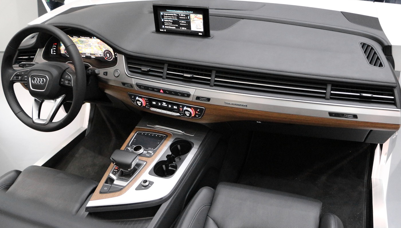 (Source Audi Septembre 2017) A partir de 62 000 euros : Airbags grand volume pour conducteur et passager avant, désactivable côté passager, Airbags latéraux (airbags thorax et bassins à l’avant) et système d'airbag de tête, ASR (antipatinage) pour une motricité et une rigidité transversale optimales. Réduit le patinage des roues motrices, Audi Connect "Sécurité et Service" : avec une carte SIM de données intégrée (valable pour 10 ans). Inclut les services/applications des catégories "mesServices" et "monVéhicule". Voir détails en page Audi Connect., Audi drive select : réglage des caractéristiques individuelles du véhicule selon les modes disponibles : auto, comfort, dynamic, efficiency, et individual. Le mode efficiency n'est pas disponible pour la motorisation TDI 218 ch, Audi hold assist : assistant de démarrage en côte, Audi presense city : détecte les véhicules et les piétons à une vitesse entre 10 et 85 km/h. Prévient le conducteur et peut, si nécessaire, entamer une décélération afin de réduire la vitesse, Contrôle de la pression des pneus avec signaux acoustiques et visuels de perte de pression, Contrôle électronique de stabilisation (ESC) : comprend les fonctions ABS, EBV, ESC, ASR et EDS, Détecteur de pluie et de luminosité, Direction électromécanique à assistance variable, Fixations ISOFIX pour sièges enfant aux places arrière et pour le siège du passager avant avec système d'ancrage "Top Tether" pour les sièges arrière, Freins à disques ventilés à l’avant et à l’arrière, Frein de stationnement électromécanique avec fonction hold assist, désactivation automatique au démarrage et fonction frein de secours, quattro® : transmission intégrale permanente avec répartition asymétrique et dynamique du couple, Récupération d’énergie, générée lors des phases de freinage ou de décélération et système Start/Stop, permettant une économie de carburant, Rétroviseur intérieur jour/nuit automatique, Roue de secours temporaire gonflable (en version 7 places et sur Q7 e-tron quattro : roue de secours temporaire indisponible. Le kit de réparation de pneus est obligatoire), Roues avec écrous antivol, Système ABS avec répartiteur électronique de freinage EBV, programme électronique de stabilisation ESC avec détection de barres de toit et assistance au freinage d’urgence, Keyless go : Bouton start/stop pour le démarrage/arrêt du moteur sur le tableau de bord et verrouillage/déverrouillage central du véhicule via la clé télécommandée (sans dispositif de sécurité "Safe"), Appuie-tête intégraux à l’avant et à l’arrière, Rampes de pavillon chromées, Becquet de toit incluant 3ème feu stop, Coffre avec plancher de chargement réversible et couvre-bagages, Dossier de banquette arrière rabattable asymétriquement selon un rapport 35 / 30 / 35, Filet de séparation à l'arrière, Pack brillance: baguettes sur les appuis de vitres style aluminium, revêtement noir brillant à l’extérieur sur les montants de pavillon centraux et arrière, Pack fumeur, Pare-brise, vitres latérales et lunette arrière en verre athermique, Tapis de sol à l'avant et à l'arrière, Volant réglable manuellement en hauteur et en profondeur, Accoudoir central à l'avant avec vide-poches , Applications décoratives inférieures laque anodisée anthracite , Applications décoratives supérieures laque diamantée gris argent , Audi music interface avec 2 ports USB, un lecteur de carte SDXC et un port AUX-IN , Audi sound system 10 haut-parleurs 180 watts , Climatisation automatique 2 zones , Feux arrière à technologie LED sauf feux de recul , Interface Bluetooth® , Jantes en aluminium forgé style 5 bras, 8 J x 18", pneus 255/60 R 18 108 Y , Hayon de coffre à ouverture/fermeture électrique , Keyless go : Bouton start/stop pour le démarrage/arrêt du moteur sur le tableau de bord et verrouillage/déverrouillage central du véhicule via la clé télécommandée , MMI radio plus avec écran central 7" couleur HD , Ordinateur de bord couleur TFT 7" , Parking system plus avant et arrière , Préparation pour écrans arrière Accessoires d'Origine Audi® : comprend un pré-câblage dans le dossier des sièges conducteur et passager avant pour l'Audi Entertainment mobile, (génération solution de divertissement Plug and Play en Accessoires d’origine Audi®), , Projecteurs Xénon plus et feux de jour à LED , Rétroviseurs extérieurs dégivrants et rabattables électriquement (asphériques des 2 côtés) , Sellerie en tissu Initial (en version 7 places : sellerie cuir / cuir synthétique) , Sièges avant réglables en hauteur manuellement (en version 7 places : sièges avant réglables électriquement) , Volant multifonction 4 branches en cuir avec palettes de changement de rapport