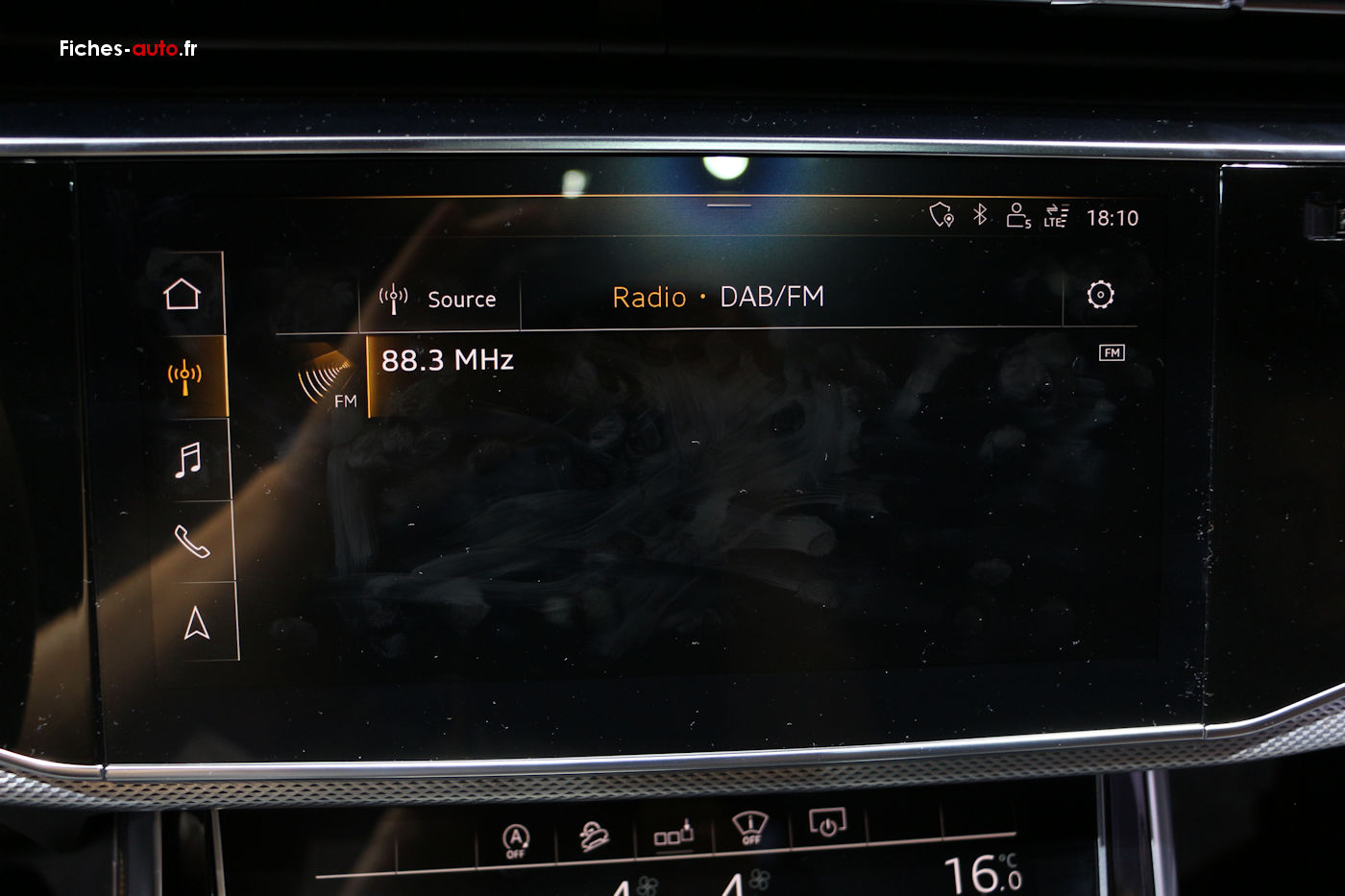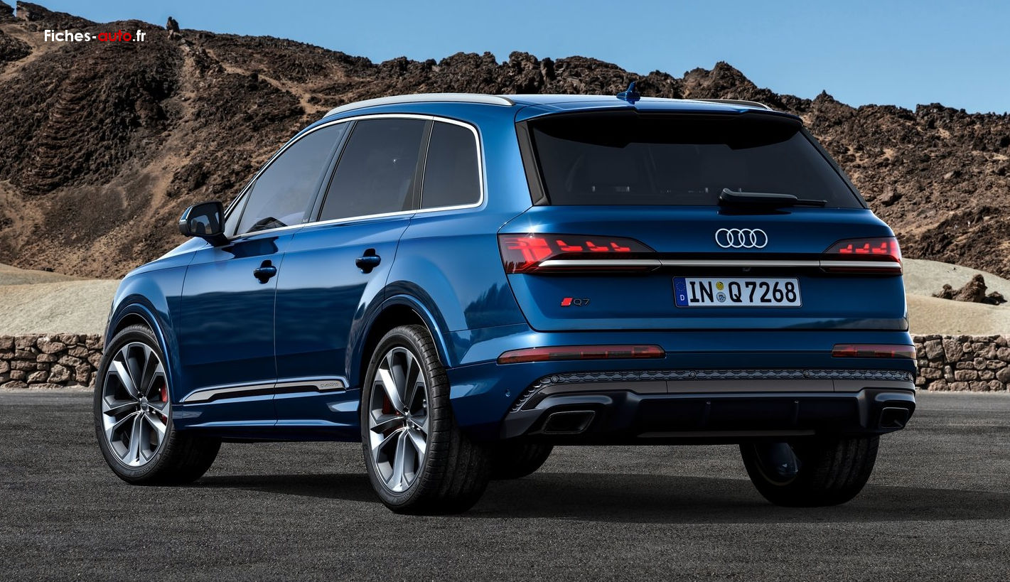 A partir de 83 000 euros : Pack Assistance City, Adaptive air suspension : suspension pneumatique automatique, Applications décoratives inférieures en aluminium beaufort noir, Applications décoratives supérieures en aluminium brossé sono, Audi phone box avec charge du téléphone par induction (Qi), Audi Smartphone interface : Apple CarPlay et Google Android Auto, Climatisation automatique confort 4 zones (climatisation 3 zones de série sur Q7 e-tron quattro), Direction intégrale (essieu arrière directionnel). Non disponible sur Q7 e-tron quattro, Jantes en aluminium coulé style étoile 10 branches 9J x 20", Sièges avant réglables électriquement avec fonction mémoire pour les sièges conducteur et passager