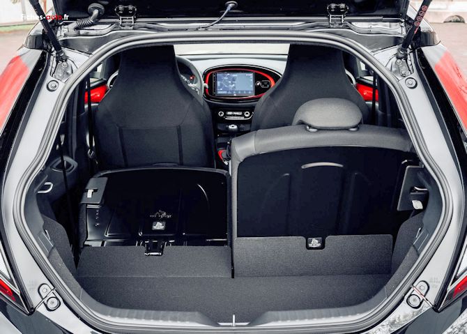 Plus longue de 24 cm par rapport à sa devancière (ainsi qu'un empattement majoré de 9 cm), l'Aygo X propose donc plus d'espace à l'intérieur même si certains auraient espérés un peu plus. Les normes de sécurité qui ont évolué induisent un renforcement de la structure, et il ne faut pas non plus omettre que ce sont aussi les places avant qui ont bénéficié de cet accroissement, avec désormais la possibilité de faire conduire des conducteurs de grand gabarit.
