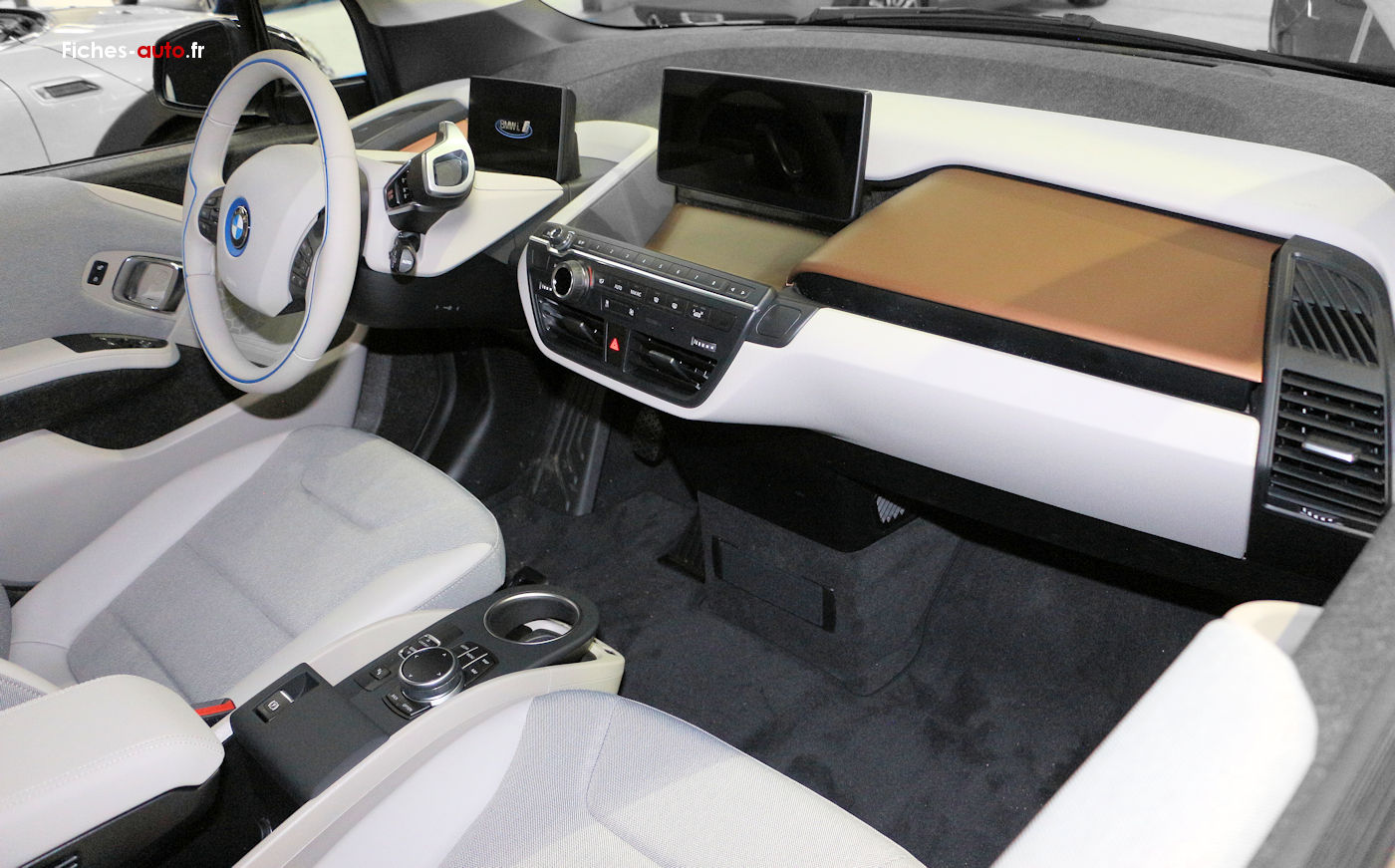 (Source BMW juillet 2016) Airbags de tête avant et arrière avec voile de protection contre les débris de verre, Airbags frontaux conducteur et passager avant (déconnectable côté passager), Airbags latéraux avant, Bandeau pare-soleil gris pour pare-brise, Ceintures de sécurité à trois points avec limiteur de tension, Cellule de sécurité en fibres de carbone, Feux de stop dynamiques, Fixation ISOFIX aux places latérales arrière, Frein de parking électrique, Kit de mobilité en cas de crevaison, Mesure individuelle de pression des pneumatiques, Triangle de présignalisation avec kit de premiers secours, Troisième feu stop à technologie LED, Freinage (Contrôle de freinage en courbe CBC, Contrôle Dynamique de la Stabilité DSC, Contrôle Dynamique de la Traction DTC, Système anti-blocage des roues ABS), Châssis (Train arrière multibras, Train avant à double articulation), Anneaux d'arrimage dans le coffre, Appuis tête intégrés au siège, Autoradio BMW Professional compatible MP3, 4 haut-parleurs, prise AUX-IN, port audio USB et streaming audio Bluetooth (avec "Music Search"), Banquette arrière 2 places avec dossiers rabattables symétriquement (50/50), Batteries lithium-ion hautes performances, capacité minimum de 70 % garantie 8 ans ou 100 000 km, Boîte de vitesses automatique avec sélecteur derrière le volant, Câble de recharge standard sur prise domestique 230 V, Carnet d'entretien électronique embarqué "BMW Service History", Clés radiocommandées à mémorisation automatique des réglages "Personal Profile", Climatisation manuelle avec filtre microporeux et fonction de recyclage d'air, Démarrage sans clé via le bouton de démarrage Start/Stop avec contour chromé, Direction électrique à assistance variable en fonction de la vitesse Servotronic, Eclairage plafonnier soft-on/soft-off et éclairage du coffre, Ecran d'information LCD 6,5" (16,5 cm) suspendu au-dessus de la console centrale, Ecran d'instrumentation LCD sur la colonne de direction, Esprit intérieur Atelier, Fonction "Ma BMW i à distance", Indicateur de maintenance CBS tenant compte des conditions de conduite, Interface Bluetooth pour téléphone portable, Mesures BMW EfficientDynamics (voir détails page 6), Notice d'utilisation intégrée, Ordinateur de bord avec Check-Control et indicateur de température extérieure, Ouverture des portes antagoniste, sans montant central, Plancher de l'habitacle plat et sélecteur de vitesse au volant permettant la libre circulation de gauche à droite dans l'habitacle, Prise 12V entre les sièges avant, Radars de stationnement arrière PDC avec représentation graphique des obstacles sur l'écran d'information central, Sélecteur de mode de conduite - 3 modes : "ECO PRO+", "ECO PRO","Comfort", Un porte-boissons dans la console centrale avant et deux entre les sièges arrière, Verrouillage centralisé avec télécommande, Vide-poches ergonomiques dans les portes avant, Vitres électriques avant avec commande par impulsion et protection anti-pincement, Volant cuir 2 branches, réglable en hauteur et en profondeur, Antenne de toit en "aileron de requin" et antenne courte, Badges apposés au niveau du hayon, "eDrive" à gauche et "i3" à droite, Carrosserie bicolore "Black Belt" : capot avant, rétroviseurs extérieurs, toit et hayon arrière de couleur noire, Feux arrière avec guides de lumière à LED, Jantes profilées 19" (48cm) style 427 à rayons en étoile, Prise de chargement illuminée à technologie LED, Rappels de clignotants à LED intégrés aux rétroviseurs extérieurs