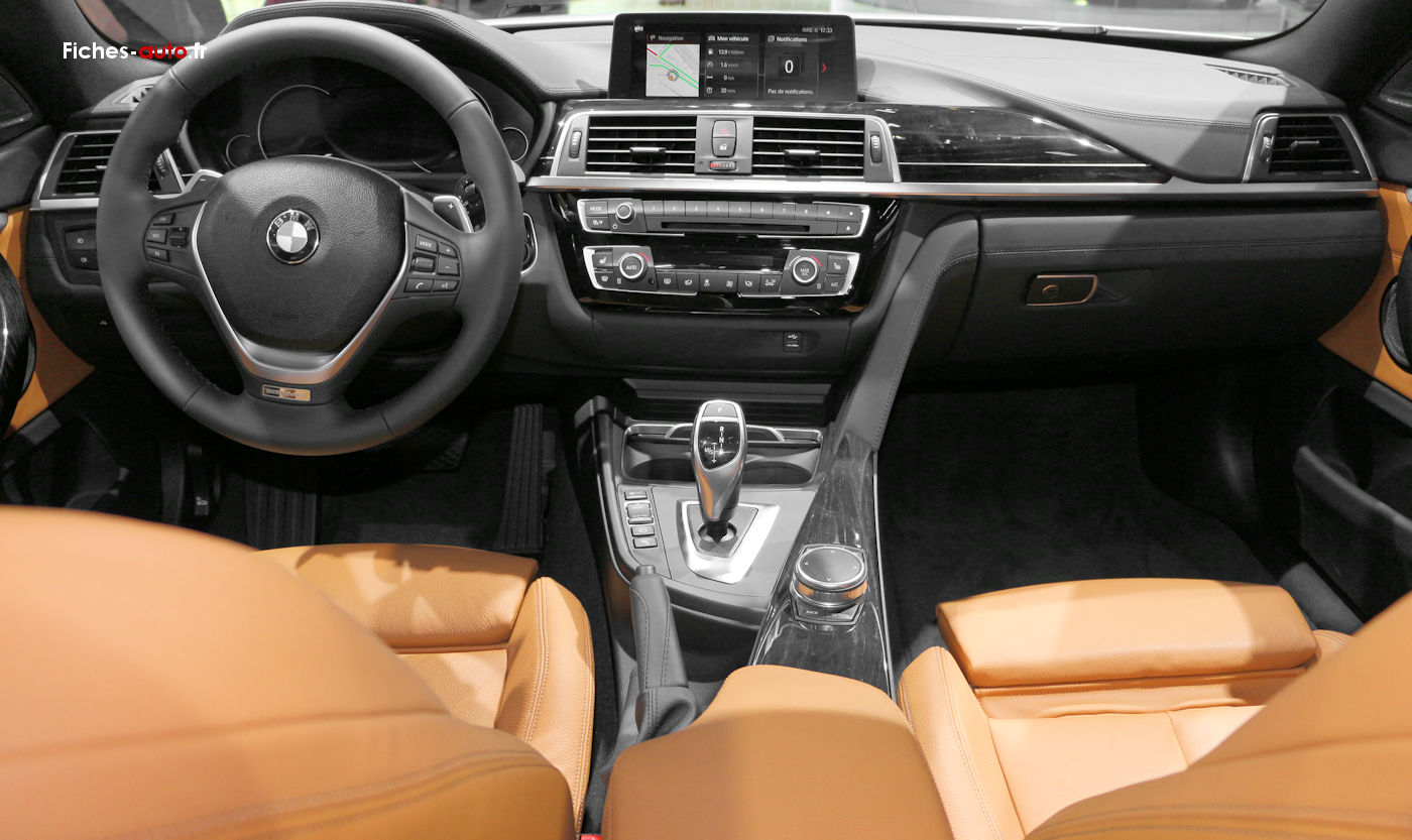 (Source BMW 2016) Antenne de toit en "aileron de requin", Baguettes de seuils de porte siglées, Contours de calandre chromé, Diffuseurs aérodynamiques latéraux "Air Breather", Feux arrière avec guides de lumière à LED, Jantes en alliage léger avec écrous antivol de roues, Pare-chocs auto-régénérants jusqu'à 4 km/h avec éléments déformables jusqu'à 15 km/h, Projecteurs avec quatre anneaux lumineux blancs à technologie LED pour éclairage diurne, Rappels de clignotants à LED intégrés aux rétroviseurs extérieurs, Vitres latérales avant et arrière sans encadrement, Airbags de tête avant et arrière avec voile de protection contre les débris de verre, Airbags frontaux conducteur et passager avant (déconnectable côté passager), Airbags latéraux avant, Anti-démarrage électronique, Appel d'urgence intelligent, Bandeau pare-soleil pour pare-brise, Buses de lave-glace et rétroviseurs extérieurs chauffants, Capteur d'impact déclenchant le déverrouillage des portes, l'allumage de l'éclairage intérieur et l'activation des feux de détresse, Carnet d'entretien électronique embarqué "BMW Service History", Ceintures de sécurité à trois points (tous les sièges) avec prétensionneur pyrotechnique et limiteur de tension (à l'avant), Contrôle Dynamique de la Stabilité DSC+, Contrôle Dynamique de la Traction DTC, Détecteur de pluie et allumage automatique des projecteurs, Différentiel à blocage électronique pour optimiser la motricité, Feux de stop dynamiques, Fixations ISOFIX aux places latérales arrière, Indicateur de maintenance CBS tenant compte des conditions de conduite, Kit de mobilité en cas de crevaison, Lave-projecteurs, Mesure individuelle de pression des pneumatiques, Projecteurs anti-brouillard, Services après ventes connectés BMW TeleServices, Triangle de présignalisation avec kit de premier secours, Accoudoir central arrière, Accoudoir central avant coulissant, Anneaux d'arrimage dans le coffre, Appuis tête ajustables, réglables en hauteur et inclinables, Autoradio BMW Professional CD compatible MP3, 6 haut-parleurs, prise AUX-IN, port audio USB, double Tuner, RDS et streaming audio Bluetooth (avec "Music Search"), Banquette arrière 3 places avec dossiers rabattables en deux parties (60/40), Clés radiocommandées à mémorisation automatique des réglages "Personal Profile", Climatisation automatique avec filtre microporeux et fonction de recyclage d'air, Commande électrique du hayon (ouverture et fermeture), Démarrage sans clé via le bouton de démarrage Start/Stop avec contour chromé, Deux porte-boissons dans la console centrale avant, Eclairage de bienvenue et d'accompagnement "Follow-me-home", Eclairage plafonnier soft-on/soft-off et éclairage du coffre, Ecran d'information central couleur 6.5" (16,5 cm) avec commande par "Controller" iDrive et 6 touches de raccourcis programmables, Interface Bluetooth pour téléphone portable, Kit éclairage : liseuses avant/arrière, éclairage d'ambiance, espace pour les jambes avant, diodes sous les poignées de portes extérieures, Kit fumeurs, Limiteur et régulateur de vitesse avec maintien de la vitesse en descente, Mesures BMW EfficientDynamics (voir détails page 6), Miroirs de courtoisie éclairés intégrés aux pare-soleil, Notice d'utilisation intégrée, Ordinateur de bord avec Check-Control et indicateur de température extérieure, Prise 12V dans la console centrale avant, Radars de stationnement arrière PDC avec représentation graphique des obstacles sur l'écran d'information central, Rétroviseurs extérieurs à réglages électriques, Sélecteur de mode de conduite - 3 modes : "ECO PRO", "Comfort" et "Sport", Verrouillage centralisé avec télécommande, Vide-poches ergonomiques dans les portes avant, Vitrage teinté pour réduire l'échauffement dû à l'ensoleillement, Vitres électriques avant avec commande par impulsion et protection anti-pincement, Volant Sport 3 branches gainé cuir avec touches multifonctions, réglable en hauteur et en profondeur