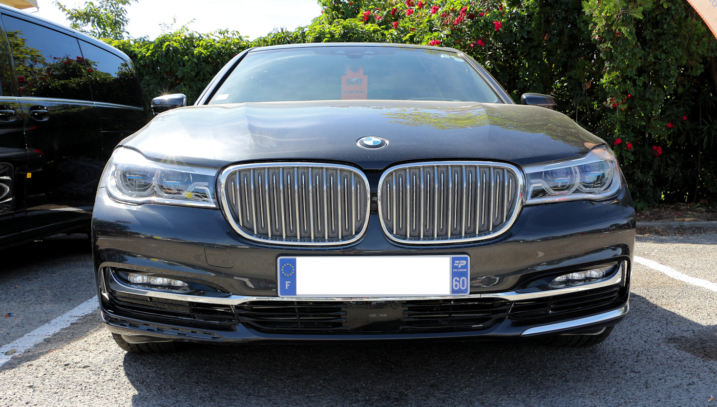 (Source BMW Octobre 2017) A partir de 84 800 euros Antenne radio intégrée à la lunette arrière / Applications chromées au niveau des projecteurs antibrouillard à LED / Bouclier avant avec diffuseurs aérodynamiques "Air Curtains" / Calandre avec doubles barreaux mobiles "Active Air Stream" / Chrome Line extérieur avec pan coupé de Hofmeister (3ème vitre latérale) d'un seul tenant / Clignotants blancs LED intégrés dans les boîtiers des rétroviseurs extérieurs / Diffuseurs aérodynamiques latéraux "Air Breather" en chrome, prolongés par un jonc chromé parcourant toute la ligne de bas de caisse / Inserts décoratifs en bois précieux / Jantes en alliage léger avec écrous de roues antivol / Projecteurs antibrouillard à LED / Projecteurs Full LED, inclut quatre anneaux lumineux pour fonction d’éclairage diurne et réglage de la portée des projecteurs / Sorties d'échappement droite et gauche intégrées dans les pare-chocs arrière / Support de rétroviseurs en chrome, dans le prolongement du chrome line / Teinte de carrosserie métallisée / Airbags frontaux conducteur et passager avant (déconnectable côté passager) / Airbags de tête avant et arrière avec voile de protection contre les débris de verre / Airbags latéraux avant / Alarme antivol / Anti-démarrage électronique / Buses de lave-glace et rétroviseurs extérieurs chauffants / Carnet d'entretien électronique embarqué "BMW Service History" / Ceintures de sécurité à trois points avec prétensionneur pyrotechnique (à l’avant) et limiteur de tension (à l’avant et aux places latérales arrière). / Construction allégée intelligente "BMW Carbon Core" combinant Carbone, Aluminium et Acier / Contrôle Dynamique de la Stabilité DSC+ / Contrôle Dynamique de la Traction DTC / Détecteur de pluie et allumage automatique des projecteurs / Détection d'occupation du siège passager avant / Feux de stop dynamiques / Fixations ISOFIX aux places latérales arrière / Frein de parking électromécanique avec fonction "Automatic Hold" / Indicateur de maintenance CBS tenant compte des conditions de conduite / Mesure individuelle de pression des pneumatiques / Pare-chocs auto-régénérants jusqu'à 4 km/h avec éléments déformables jusqu'à 15 km/h / Pneumatiques RSC permettant le roulage à plat / Portes arrière avec sécurité enfants / Protection active des occupants en cas de situation imminente d'accident (fermeture automatique des fenêtres, freinage automatique après l'accident, pré-tension des ceintures) et détecteur de somnolence / Rétroviseurs intérieur et extérieur côté conducteur électrochromes anti-éblouissement / Sélecteur de mode de conduite - 6 modes : ECO PRO, Comfort, Comfort+, Sport, Sport+, Adaptive / Triangle de présignalisation avec kit de premiers secours / Freinage : Aide au démarrage en côte, pré-charge du circuit de freinage au lever de pied, séchage des disques de freins et compensation du fading, Assistance au freinage d'urgence DBC, Contrôle de freinage en courbe CBC, Freins à disques ventilés à l'avant et à l'arrière, Système anti-blocage des roues ABS / Châssis : Suspension pneumatique à l'avant et à l'arrière avec correcteur d'assiette et garde au sol augmentable de 20 mm jusqu'à 35 km/h, Train arrière multibras, Train avant à double articulation / Pack Safety : Avertisseur d'angle mort (>20km/h avec voyant d'alerte) Avertisseur de franchissement de ligne (>70km/h avec vibrations dans le volant) Avertisseur de risque de collision avant (>15km/h, préconditionnment du freinage >50km/h, assistance au freinage) Avertisseur de risque de collision arrière (déclenchement automatique des warning) Système anti-collision à basse vitesse (<60km/h avec freinage automatique, choc évité jusqu'à 30km/h) Protection active des piétons (<60km/h avec freinage automatique, choc évité jusqu'à 30km/h) Avertisseur de trafic transversal arrière (Avertisseur en cas de circulation transversale détectée derrière la voiture), Indicateur de limitation de vitesse et d'interdiction de dépassement. / 5 prises 12V dans les consoles centrales avant et arrière et dans l'accoudoir central avant / Accès Confort aux 4 portes avec fonction d'ouverture / fermeture sans contact du coffre "Smart Opener" / Accoudoir central arrière avec tablette tactile BMW Touch Command / Autoradio BMW Professional CD, prise AUX-IN, port audio USB et streaming audio Bluetooth (avec fonction "Music Search") / Boîte automatique Sport à 8 rapports avec palettes au volant / Clé intelligente "BMW Display Key" permettant d'afficher les statuts de la voiture, les statuts des ouvrants, le niveau de carburant avec l'autonomie associée, de pré-ventiler l'habitacle, avec mémorisation automatique des réglages "Personal Profile" / Climatisation automatique 2 zones à fonctionnalités étendues avec écran tactile et filtre microporeux et fonction de recyclage d'air / Combiné d'instrumentation avec technologie "Black Panel" avancée de 12,3'' (31 cm) / Commande gestuelle "BMW Gesture Command" / Connectivité avancée sans fil avec Hot Spot Wifi, recharge sans fil par induction et interface bluetooth pour téléphone portable / Deux porte-boissons dans la console centrale avant et deux dans l'accoudoir central arrière / Eclairage d'ambiance avec 6 couleurs au choix (blanc, orange, bleu, bronze, lila et vert) / Eclairage de bienvenue et d'accompagnement "Follow-me-home" / Eclairage plafonnier soft-on/soft-off et éclairage du coffre / Fermeture assistée des portes et du coffre Soft Close / Kit fumeurs / Limiteur et régulateur de vitesse avec maintien de la vitesse en descente / Mesures BMW EfficientDynamics (voir détails page 6) / Miroirs de courtoisie éclairés intégrés aux pare-soleil / Navigation multimédia Professional avec "Controller" iDrive Touch, écran tactile (26 cm) et 7 touches de raccourcis programmables / Notice d'utilisation intégrée / Planche de bord et partie h
