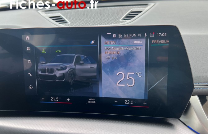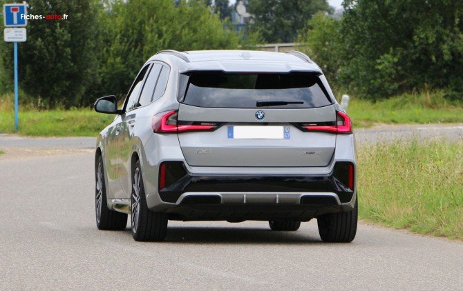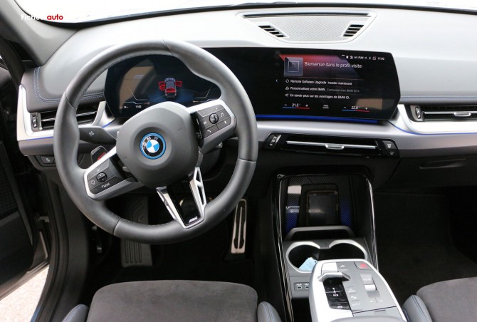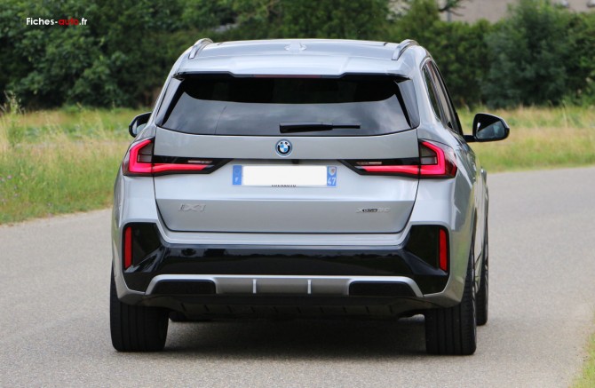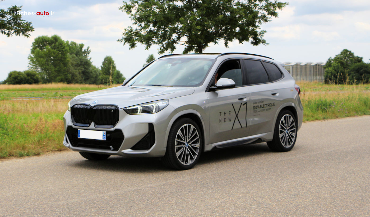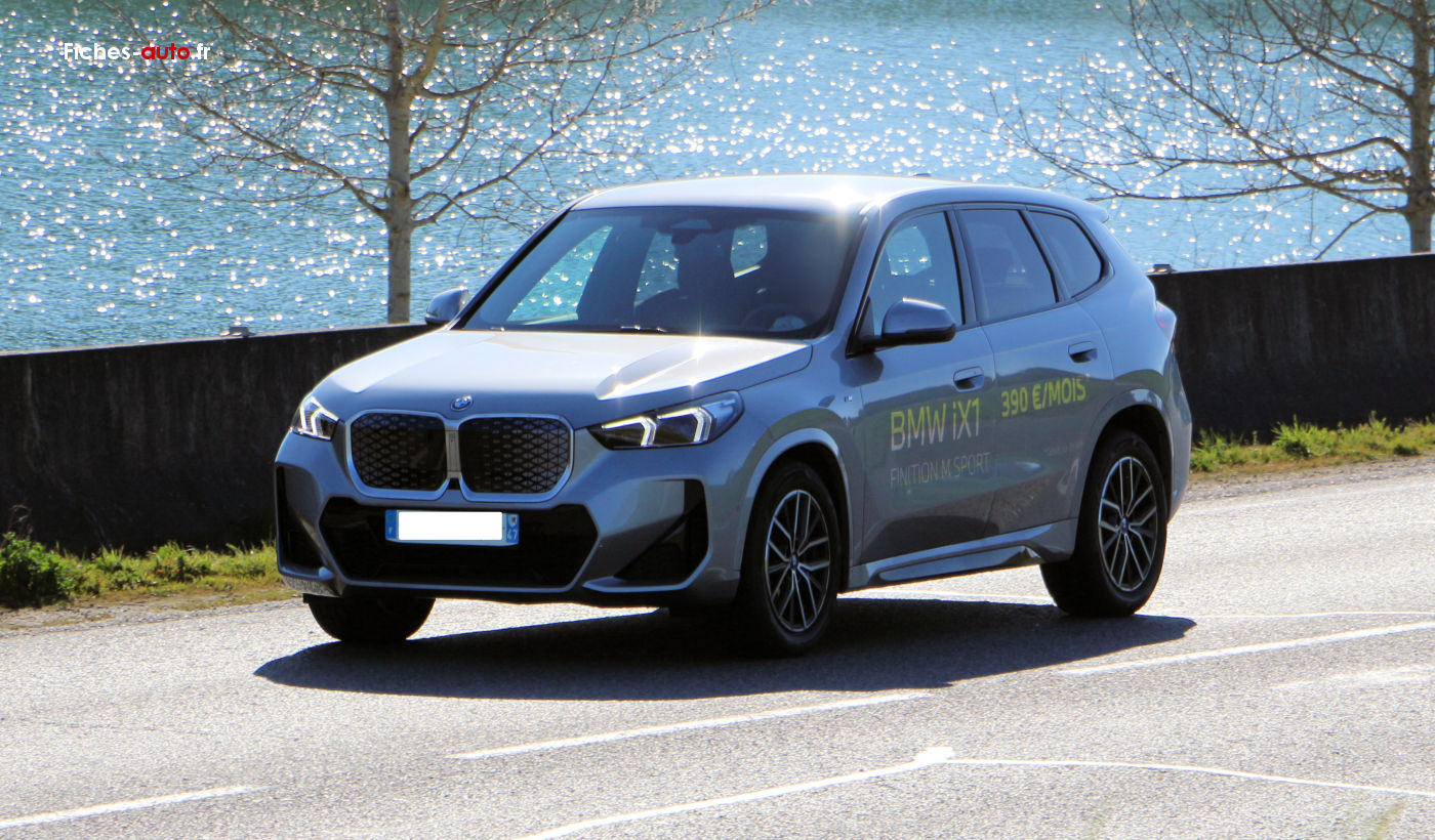 (Source BMW octobre 2023) A partir de 42 600 euros : Projecteurs LED // Feux arrière à LED intégrant les clignotants // Grilles de calandre cerclées de chrome avec barreaux verticaux noirs // Rétroviseurs extérieurs couleur carrosserie et chauffants avec rappels de clignotants intégrés // Rails de toit Shadowline M brillant (En option sur iX1) // Écran Widescreen // Kit éclairage // Kit rangement // Volant Sport gainé cuir avec touches multifonctions // Active Guard // Airbag passager désactivable via la clé // Airbags frontaux et latéraux pour conducteur et passager avant, airbags de tête à l'avant et aux places latérales arrière, airbag entre les 2 sièges avant en cas de collision latérale // Ceintures de sécurité 3 points à toutes les places // Contrôle de stabilité dynamique avec dotation élargie // Écrous de roues antivol // Feux de sortie de porte avant (porte ouverte) // Services Après-vente connectés BMW Teleservices (durée de vie de la voiture) // BMW Live Cockpit Plus // Carte SIM 4G LTE pour les Services ConnectedDrive // Connectivité téléphone Bluetooth avec interface USB // Hotspot WiFi // Pack Connected Pro // Ports USB Type C à l'avant (x2) et à l'arrière (x2) // Système audio 6 haut-parleurs // Tuner DAB // Climatisation automatique bi-zone avec microfiltre // Commande électrique du hayon de coffre // Détecteur de pluie et allumage automatique des projecteurs // Direction à assistance électrique Servotronic // "Follow Me Home": les feux de croisement restent allumés quelques instants une fois le contact coupé // Fonction Start&Stop automatique avec démarrage sans clé // Frein de parking électromécanique avec "Automatic Hold" // Lève-vitres avant et arrière électriques avec commande par impulsion et sécurité enfants // Mesure individuelle de pression des pneumatiques // My Modes avec 5 modes de conduite : Personnel, Efficient, Sport, Relax, Expressive // Park Assist // Prises de courant 12 volts : console avant et coffre // Régulateur de vitesse avec freinage et limiteur de vitesse // Système de détection de somnolence (>70km/h) // Verrouillage centralisé : portes, coffre et trappe à carburant
