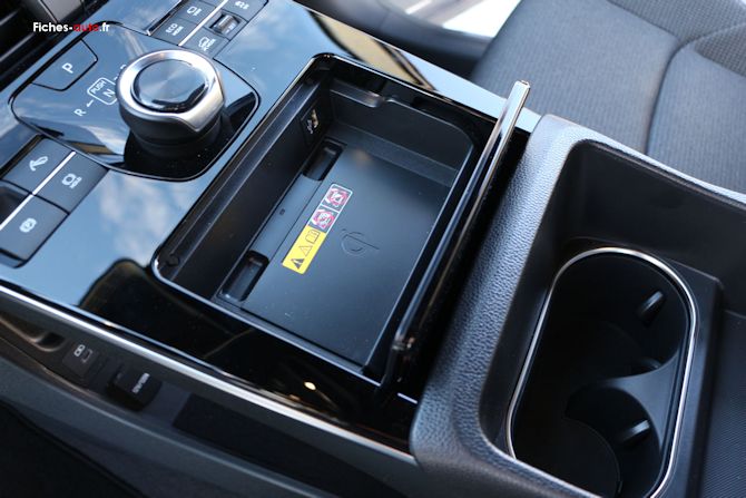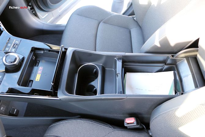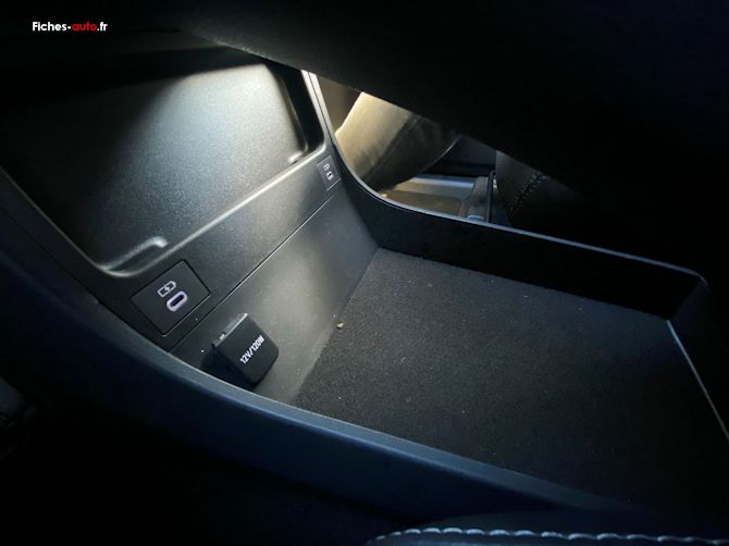 Niveau rangements c'est plutôt bon. On a sur le dessus un petit compartiment fermable pour le téléphone (avec charge par induction) et juste derrière une grande boîte à gants (pas trop reculée, elle reste donc accessible). Entre les deux se situe un porte-gobelets Enfin, il y a un grand bac sous la console centrale mais cette dernière est à ciel ouvert et se rebords ne sont pas assez haut pour y loger beaucoup de choses.