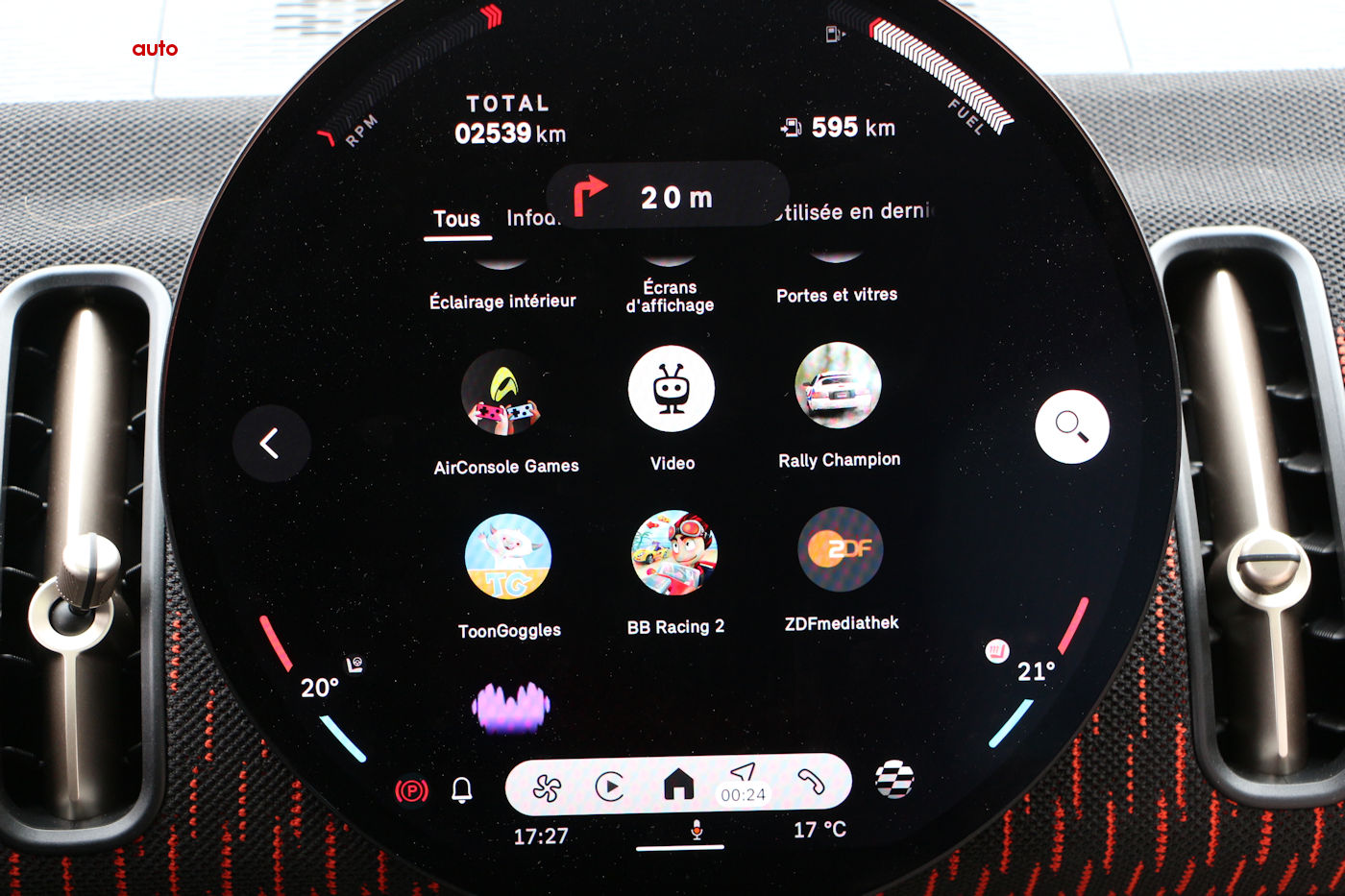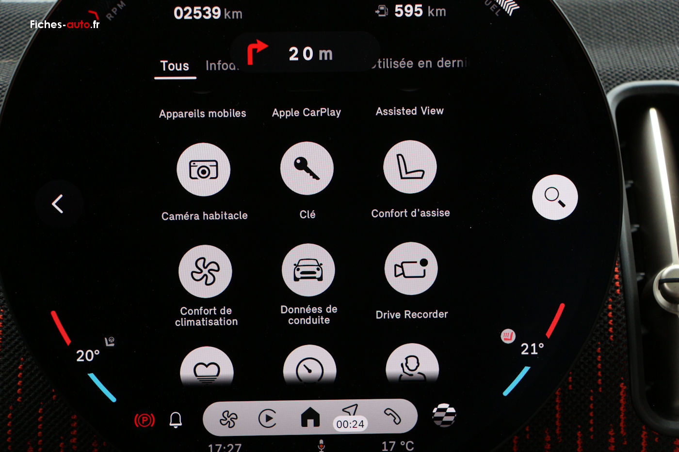 Si avec son écran rond l'ambiance est de mise, niveau praticité ça atteindra vite ses limites lors de certaines utilisations, notamment tout ce qui est programmée sur une base carrée : vidéo, jeux, Apple Car play etc. Pour le reste ça va, les menus et cartes ont été pensées pour cette forme, mais tout ce qui provient de l'extérieur se révèle pénalisé par un affichage amoindri (pour que le rectangle passe dans le rond). Dommage car on est ici appuyé sur une bonne base technique, à savoir Android Automotive qui reste une référence.