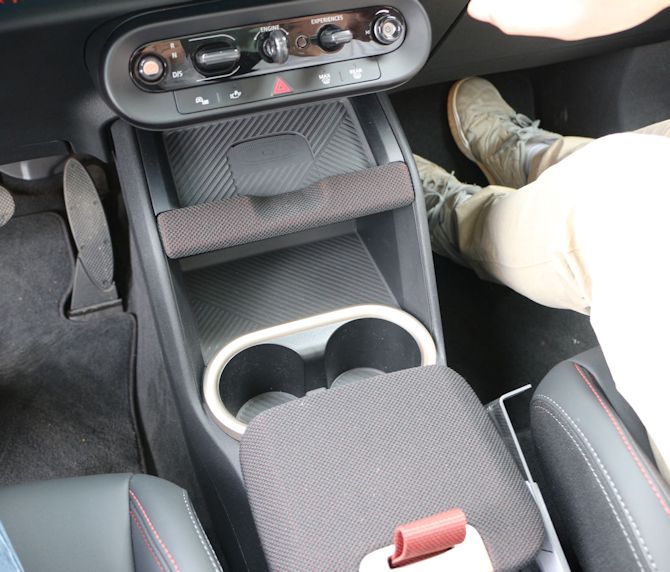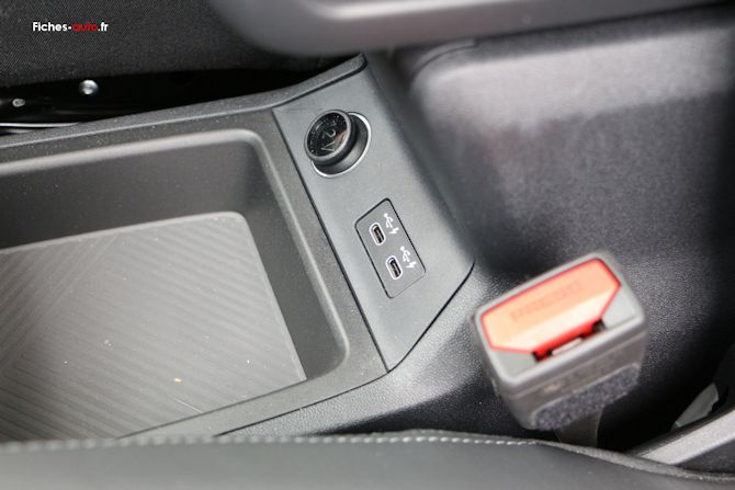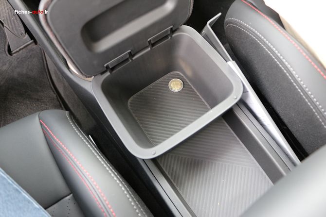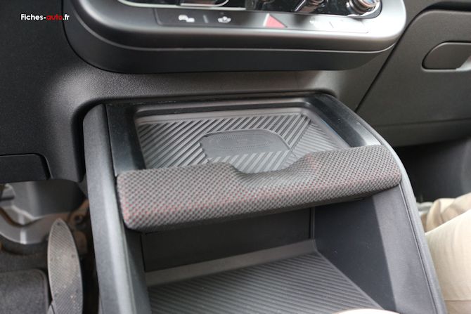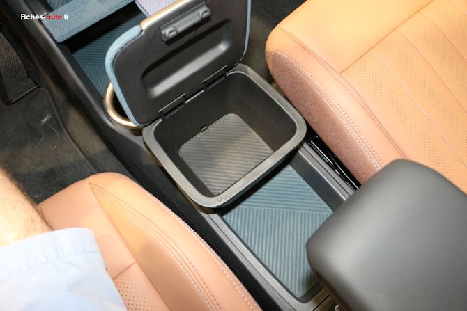 Concernant les rangements on aurait pu espérer un peu mieux. Car si l'espace entre les occupants avant a été bien libéré, ce qu'ils ont installé n'est toutefois pas des plus convaincants. On a tout d'abord un chargeur par induction pour téléphone, pour un seul hélas ... Sous ce dernier se situe une autre cavité mais elle est elle aussi non cloturable. Juste devant se situent des portes gobelets non amovibles et fonctionnels comme on le voit sur de plus en plus de voitures (porte-gobelets qu'on peut transformer en boite rectangulaire par exemple). Arrive enfin une sorte de boite avec un petit capot qui ne peut hélas pas être bougée, alors qu'elle semble à la base pouvoir le faire. De plus, cette dernière se révèle un peu basse pour qu'elle soit parfaite en termes d'accessibilité. Devant cette boîte qui semble posée au sol on a la continuité du grand rangement ouvert et donc accessibles à tous les regards.