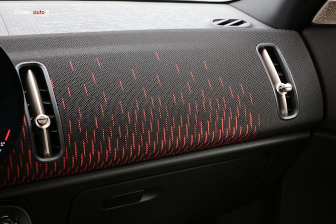 Le fameux tissus que PSA / Stellantis a lancé dans les années 2017, il a été copié depuis par une myriade de marques dont Mini. Et en effet, on peut dire qu'ils ont eu ici la main lourde car le fameux tissus recouvre et remplace toutes les parties hautes en plastiques de la planche de bord. Ce dernier ne me semble toutefois pas adapté à l'utilisation faite dans une voiture, et c'est sans doute pour ça que les constructeurs n'ont jamais vraiment utilisé ce matériau par le passé. C'est en effet à la fois un nid à poussière et à toute tâche liquide (même de l'eau risque de faire des auréoles ..). A cela s'ajoute une relative fragilité et une propension à accrocher les bagues plus ou moins torturées de madame ...