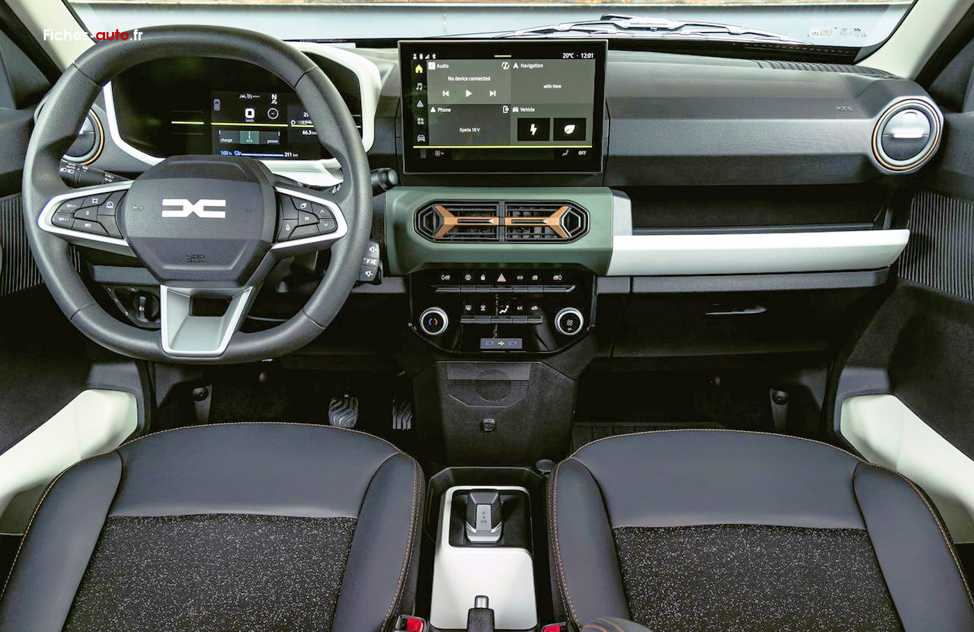 (Source Dacia 2025) A partir de 16 900 euros : Feux de jour LED signature Y // Projecteurs halogènes // Allumage automatique des feux // Jantes acier 14 pouces avec enjoliveurs // Rétroviseurs extérieurs réglables électriquement // Poignées de portes noires // Boucliers noirs // Direction assistée électrique // Freinage régénératif avec mode B // ABS / ESP / Aide au démarrage en côte // Airbags frontaux et latéraux // Alerte de franchissement de ligne // Aide au maintien dans la voie // Reconnaissance des panneaux // Freinage automatique d'urgence // Tableau de bord numérique 7 pouces // Support smartphone avec application Dacia Media Control // Bluetooth // Prise USB // Prise 12V // Commandes au volant // Climatisation manuelle // Vitres avant électriques // Banquette arrière rabattable // Sellerie tissu // Ordinateur de bord // Charge AC 6.6 kW // Câble de recharge domestique // Batterie 26 kWh // Mode Eco.
