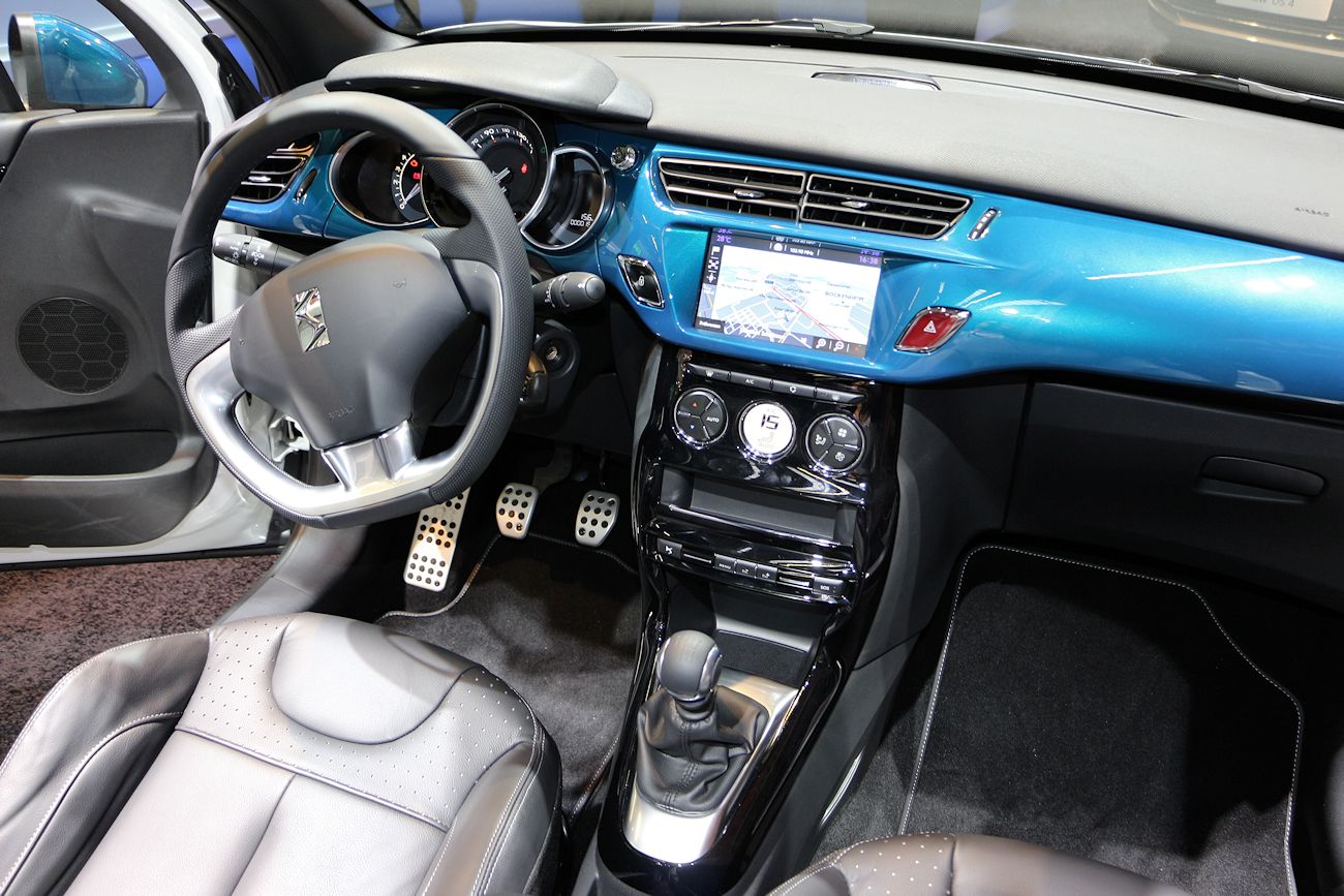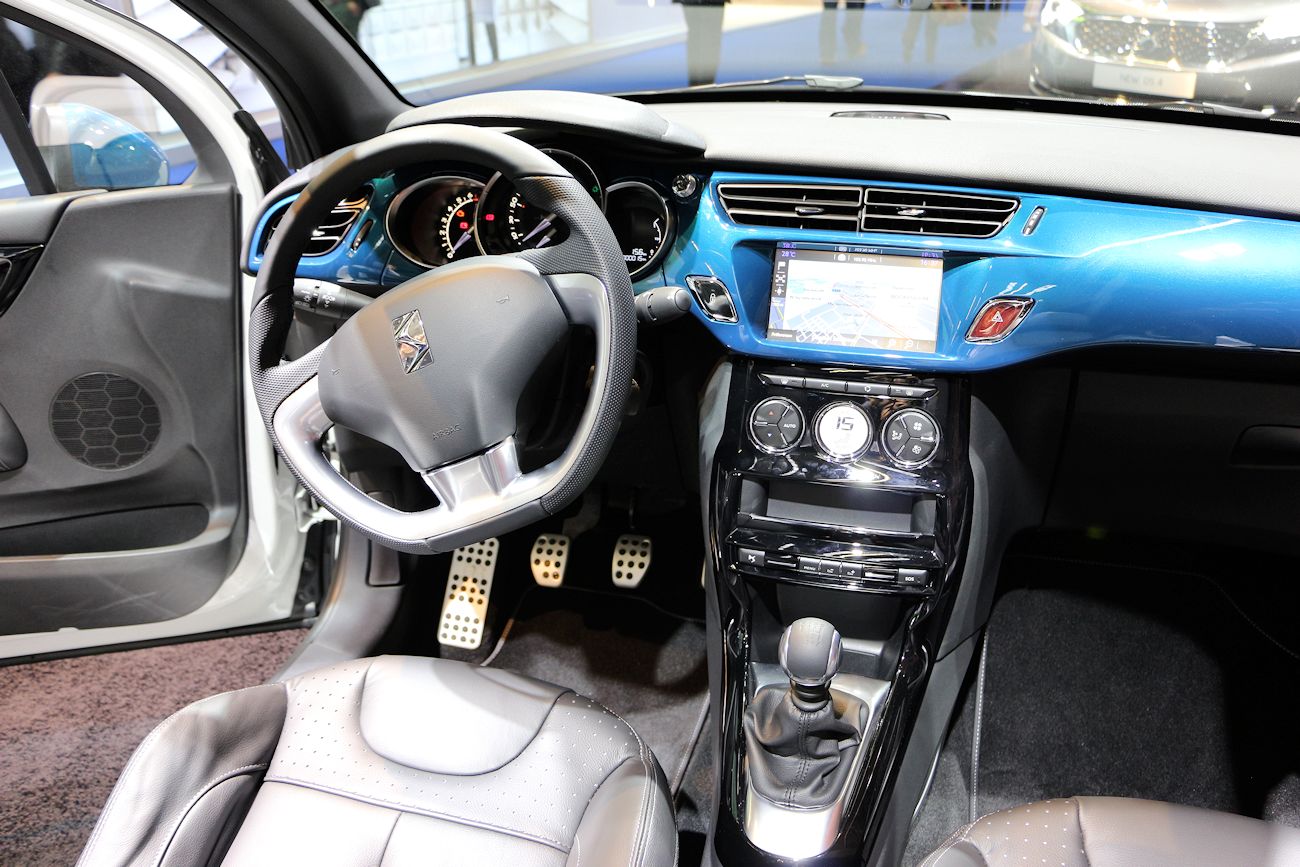 Commençons la présentation de l'intérieur de la DS3 en observant le style unique de la planche de bord. On n'avait pas vu une telle audace depuis la sortie de la Mini. En effet, que ce soit dans le look très futuriste ou même dans l'emploi de matériaux pas très courants (planche de bord entièrement laquée). Cependant il ne faut pas se laisser aller à être séduit par tous ces artifices car il faut reconnaître que la qualité perçue des plastiques et matériaux employés ne sont pas vraiment exceptionnels ... De plus, le noir laqué se révèle très salissant et le moindre doigt posé dessus y laissear une trace. Précisons que l'intérieur n'est qu'un copier coller de la Citroën C3 de même génération ce qui réduit un peu le côté exclusif de la DS3. Concernant l'habitabilité elle se révèle très honnête avec la possibilité d'accueillir cinq personnes alors qu'une Alfa-Romeo Mito ne peut par exemple en accueillir que quatre. Le coffre se révèle lui aussi dans la très bonne moyenne avec un peu plus de 300 l de contenance, meilleur qu'une Mini. Concernant le confort il s'avère très satisfaisant sans avoir à pénaliser le comportement routier qui reste de haute volée. Citroën est dans ce domaine plutôt très compétent contrairement à d'autres qui proposent des voitures dont la suspension pénalise bien trop le confort.