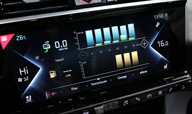 Le deuxième mode est l'électrique (eSave), qui bloque donc le démarrage du moteur thermique tant qu'il y a du jus dans les batteries évidemment. Bref, on est ici en mode électrique forcé, avec le moteur arrière qui est privilégié sur l'E-Tense de 300 ch et donc celui de l'avant sur la 225 ch en traction.