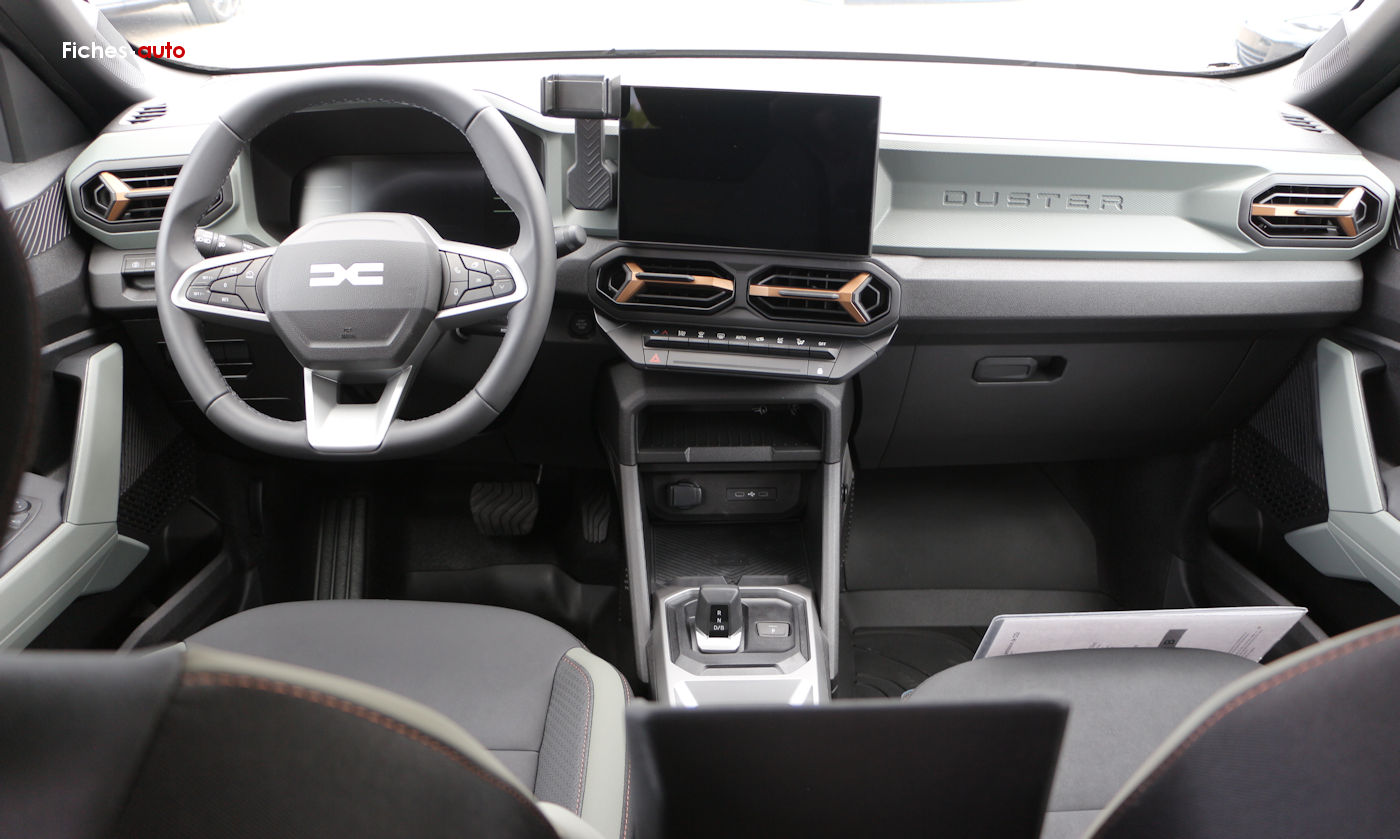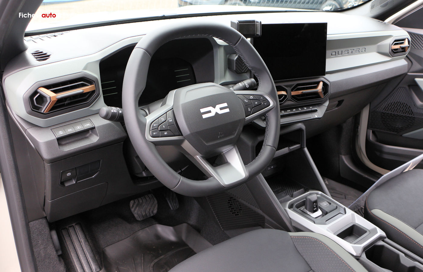 L'intérieur de ce Duster III peut presque faire penser à un genre de Land Rover, à la fois stylé mais encore rustique. La présentation confère un sentiment de robustesse et une ambiance de toute terrain pur et dur. Toutefois, et si les photos laissent penser que cet habitacle va jusqu'à être cossu, en réalité la perception es matériaux reste médiocre. Tout est ici dur et les plastiques sont pour certains mal ajustés tout en étant relativement sensibles aux agressions (on les raye assez facilement). Et cela devient désagréable si vous conduisez le coude à la portière, car ce plastique dur aura vite raison de l'endurance de votre coude (lui aussi peu amorti ...).