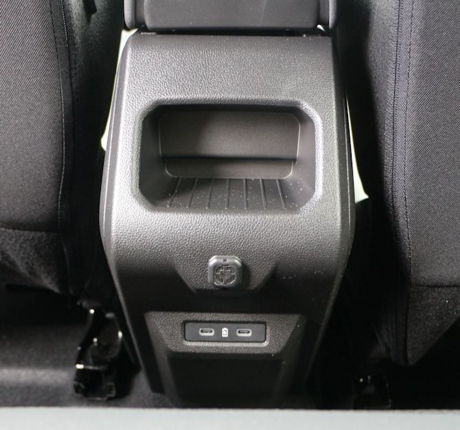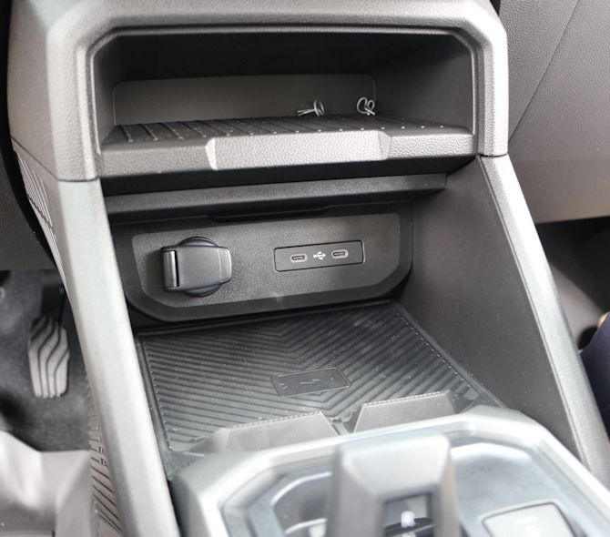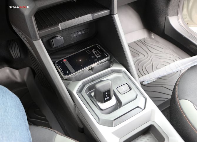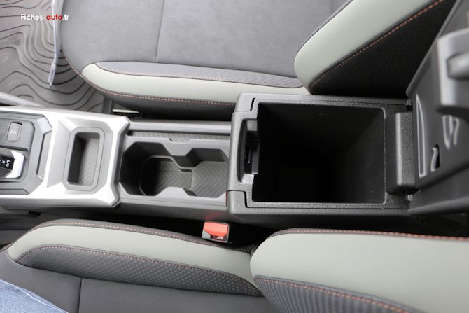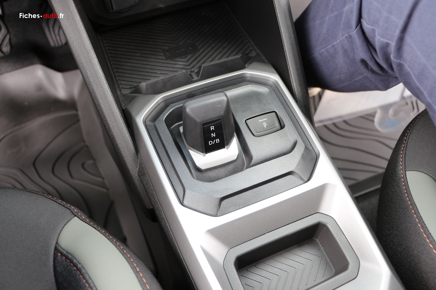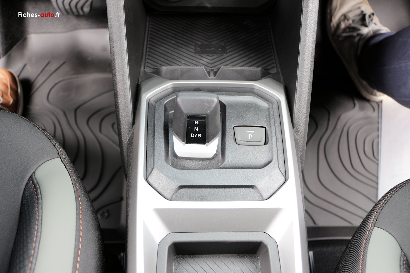 Niveau rangements ça reste aussi très quelconque, et on a à l'avant que des espaces qui ne se ferment pas mis à part l'accoudoir (moins accessible car en retrait du bras, juste sous le coude comme son nom l'indique). A l'avant on a un chargeur à induction sur la partie basse (pas de série toutefois) et un autre espace situé juste au dessus. On a ensuite la commande de boîte qui prend beaucoup de place (j'aurais aimé un commodo pour libérer tout le milieu) puis derrière un petit renfoncement pour les pièces de monnaie suivi de porte-gobelets. Vient ensuite le petit accoudoir sans grande prétention mais qui peut se régler d'avant en arrière pour l'ajuster à la position de votre coude. N'oublions pas non plus la forme creusée de la plage arrière qui permet encore une fois de ranger des affaires sans qu'elles ne glissent pour tomber.