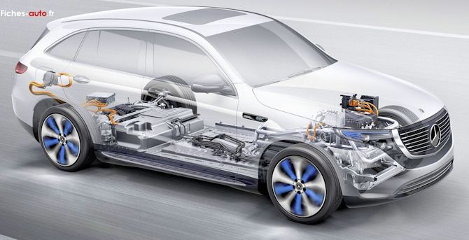 L'EQC repose sur une base technique conçue initialement pour des modèles à moteur thermique, en l'occurrence celle du GLC et de la Classe C, connue sous le nom de plateforme MFA. D'un point de vue mécanique, l'avant est doté d'une conception à bras double triangulation, à savoir le meilleur qu'on puisse avoir. L'arrière utilise sans surprise une configuration multibras.