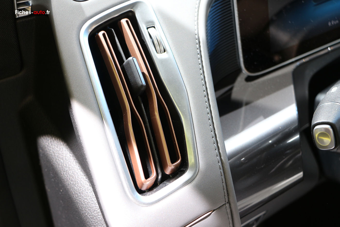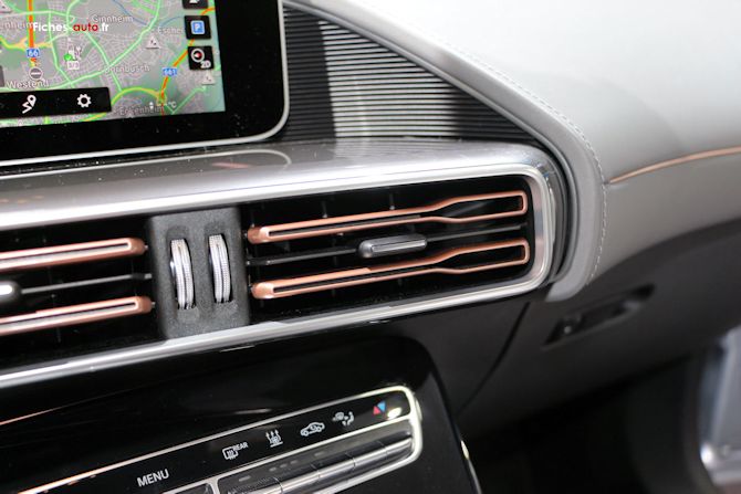 On relèvera par exemple les aérateurs à la forme particulière et à la couleur bronze / cuivre qui peuvent paraître un peu atypiques. En effet, il y a comme un petit côté rétro qui paraît un peu en décalage avec le positionnement de voiture moderne de l'EQC. D'un autre côté ça amène un sentiment de qualité même si ça peut faire un peu trop bling bling.
