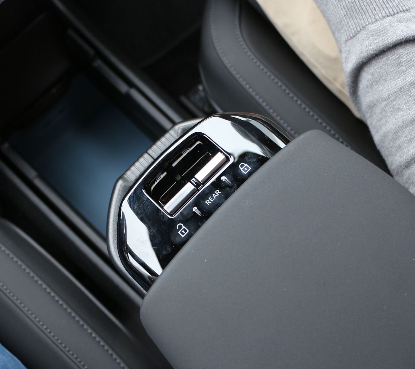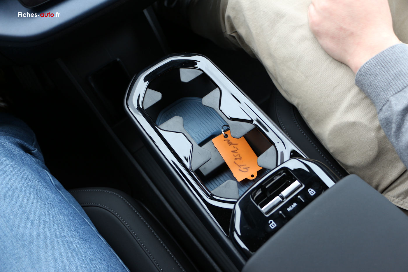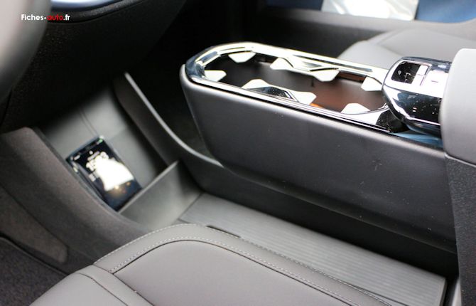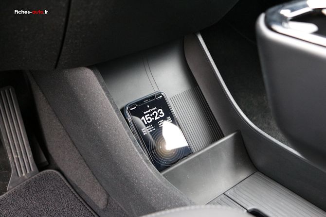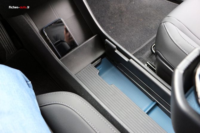 On a plus bas un grand espace vide entre la planche de bord et l'accoudoir flottant, laissant place à un rangement au sol qui rappelle un peu une Mégane E-Tech (et même bien d'autres autos). Juste devant se situe la recharge par induction pour les smartphones.