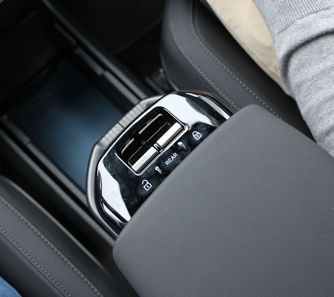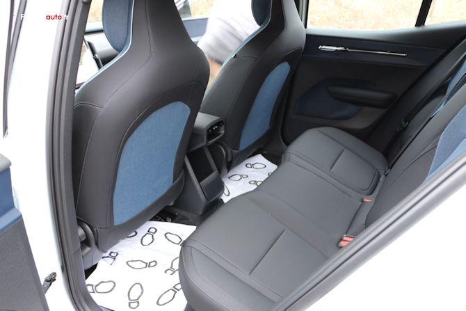 Au niveau de la logeabilité on a un espace à l'arrière assez bon même si on peut regretter que la place centrale ne dispose pas d'un plancher plat. Pour une électrique conçue nativement pour l'être, il est surprenant de voir un tunnel de servitude ... Heureusement il est anecdotique puisqu'il ,e culmine pas très haut. N'oublions pas non plus l'assise basse qui fait lever les genoux en l'air quand on y est assis, un classique sur les voitures électriques. Il n'y a aussi, et bizarrement, pas d'accoudoir au deuxième rang.
