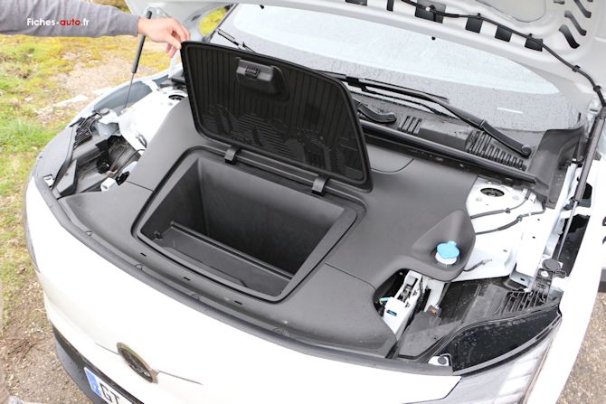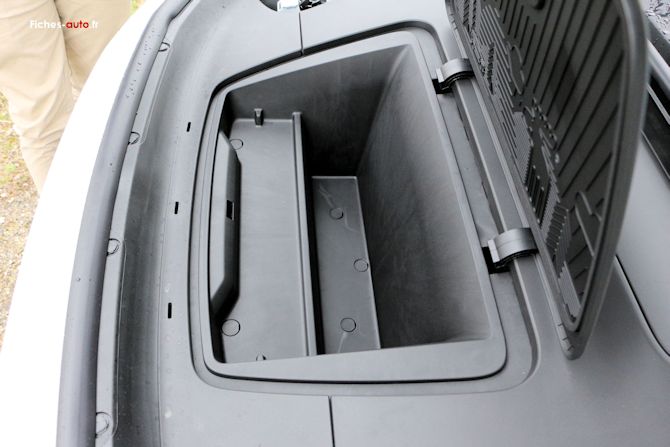 On retrouve enfin à l'avant un mini coffre annoncé à 7 litres, à peine de quoi mettre des câbles (j'imagine qu'un câble T2 ne passe pas).