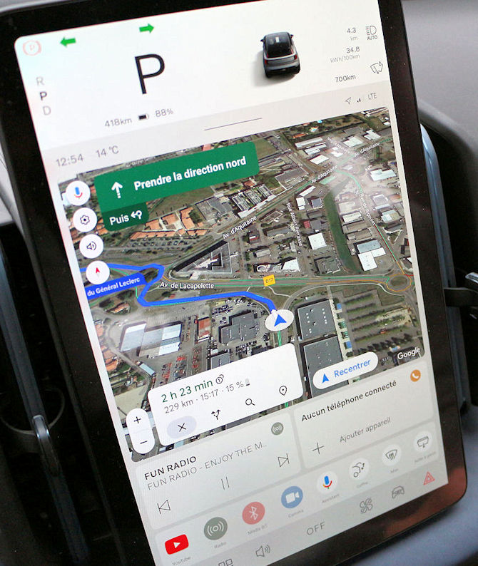 Sinon pour le reste il n'y a pas vraiment de soucis, son image et ses couleurs sont de qualité. L'interface rappelle Apple (et pourtant le système d'exploitation est Android, le concurrent direct), et donc forcément Tesla, à savoir quelque chose de très carré et neutre. Le GPS utilise Google Map et il y a un planificateur de recharge pour les longs trajets (un peu fragile dans ses choix mais il existe et on a vu pire au niveau des prestations). A cela s'ajoutent des fonctionnalités de premier plan comme le navigateur internet ou Youtube.