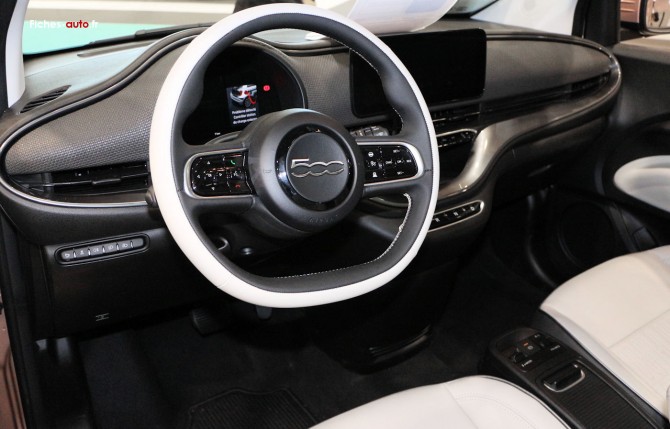 (Source Fiat Février 2020) A partir de 24 500 euros : (indisponible sur versions cabriolet et 3+1) BATTERIE 24 kWh, Jantes en acier 15 pouces, Volant avec commandes, Alerte de franchissement de ligne avec correction, Appel d'urgence e-Call, Capteurs de luminosité, Détecteur de fatigue, Direction assistée, Freinage autonome d'urgence, Reconnaissance des panneaux de signalisation, Combiné de bord TFT 7'' couleur, Condamnation automatique des ouvrants en roulant, Condamnation centralisée à distance, Démarrage sans clé, Rétroviseurs extérieurs à réglage électrique, Vitres électriques, Volant réglable en hauteur et en profondeur, Sièges avant avec réglage 4 positions, Support smartphone, Câble de recharge type 2 Mode 2 (recharge domestique), Chargeur embarqué AC mono-triphasé jusqu'à 11 kW, Prise CCS Combo 2 DC pour charge rapide jusqu'à 50 kW, Sélecteur de mode de conduite EV : Normal - Range - Sherpa, Système d'alerte sonore au piéton