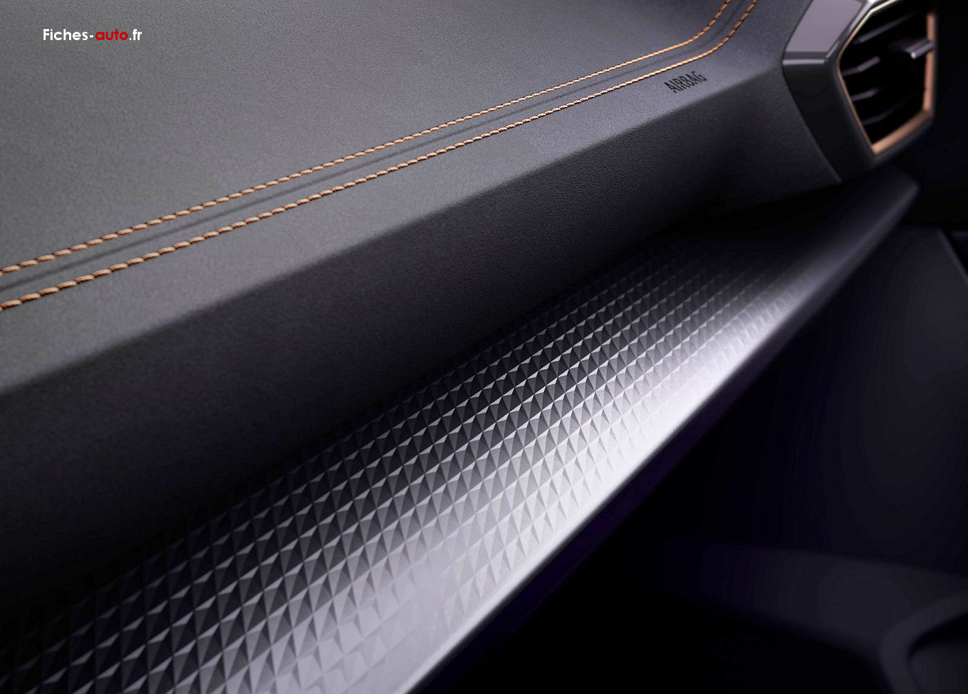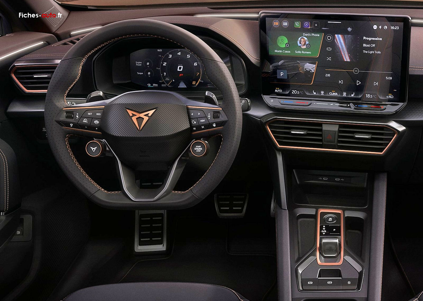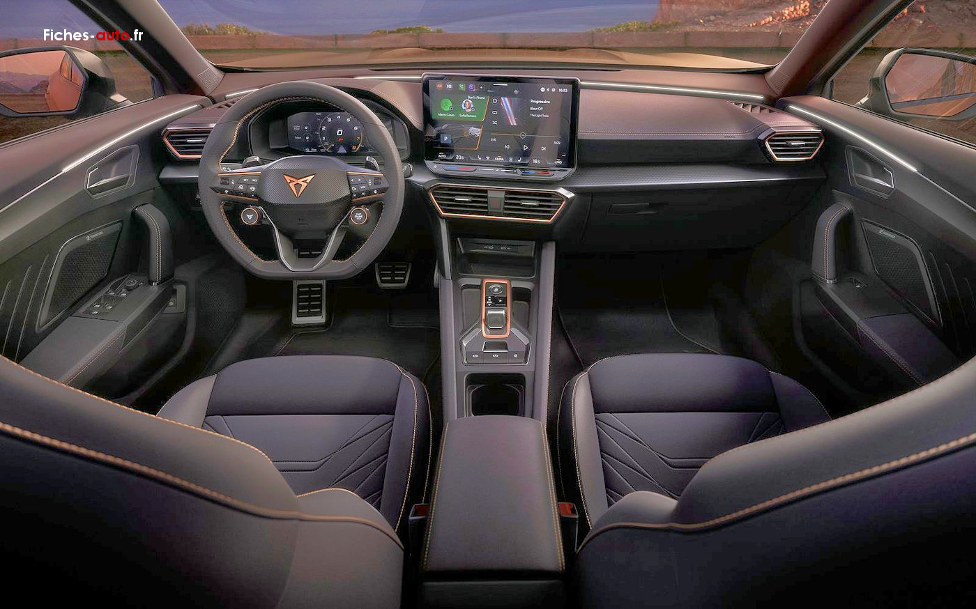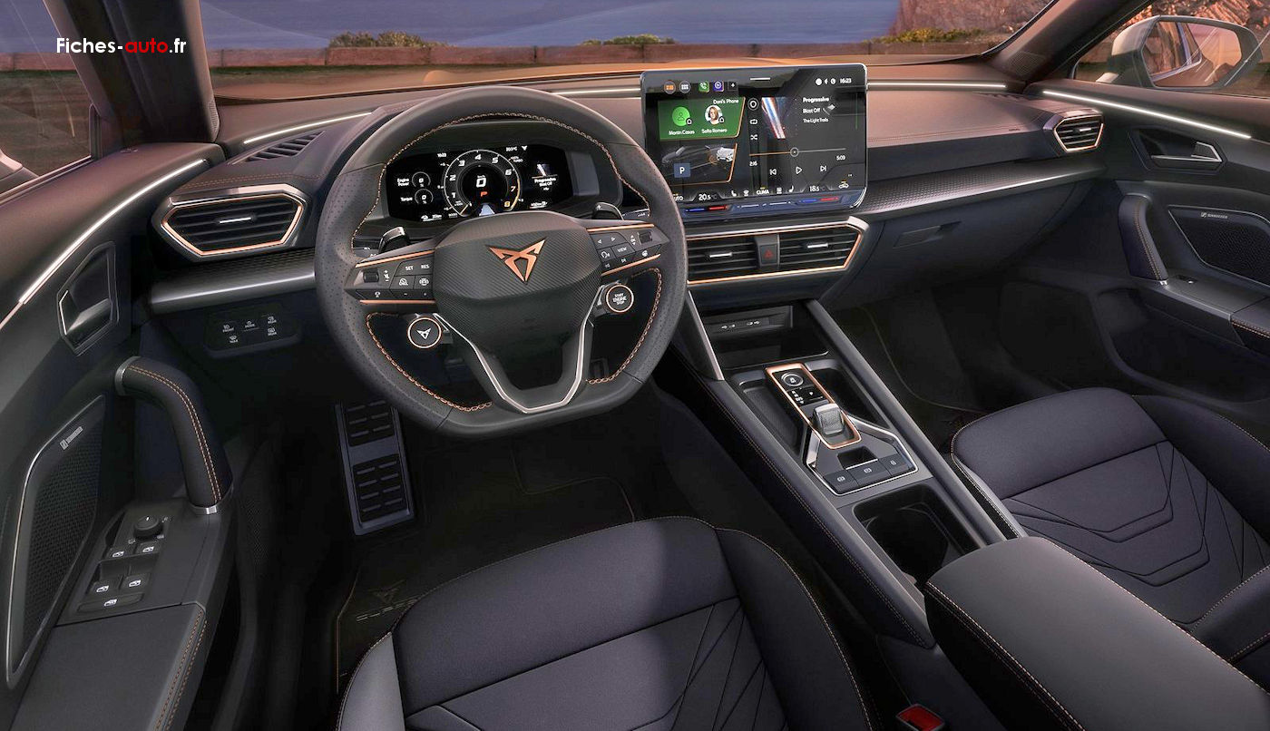 Le Formentor restylé gagne en maturité visuelle sans trahir son style d’origine. L’habitacle conserve son ambiance sportive, mais les finitions progressent sensiblement. Les matériaux deviennent plus valorisants, avec davantage de surfaces moussées et de textiles techniques, tandis que la signature lumineuse intérieure est retravaillée pour souligner les lignes de la planche de bord et des contre-portes. Les sièges conservent leur dessin enveloppant, mais reçoivent de nouveaux garnissages et surpiqûres contrastées. Cupra a également modernisé certains détails, comme le logo rétro-éclairé sur le volant ou la disparition de certains plastiques durs sur les parties basses. L’ensemble conserve une atmosphère dynamique, avec une touche plus haut de gamme et une meilleure cohérence dans l’assemblage.