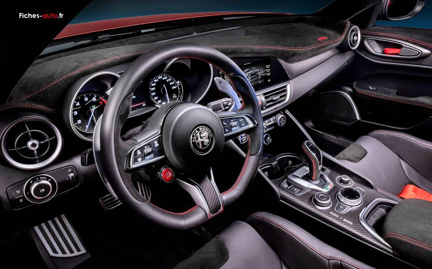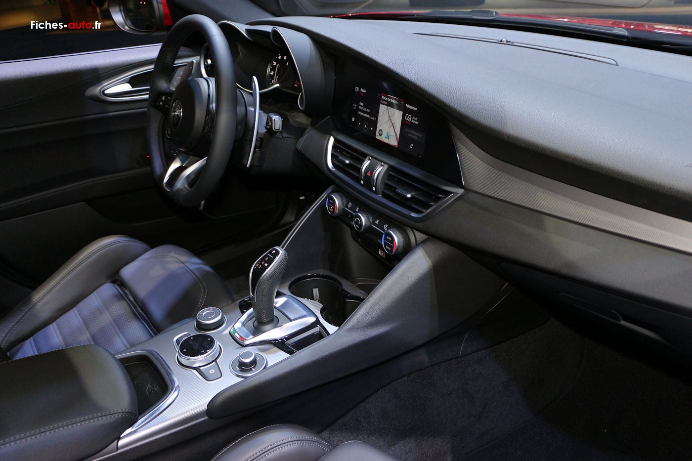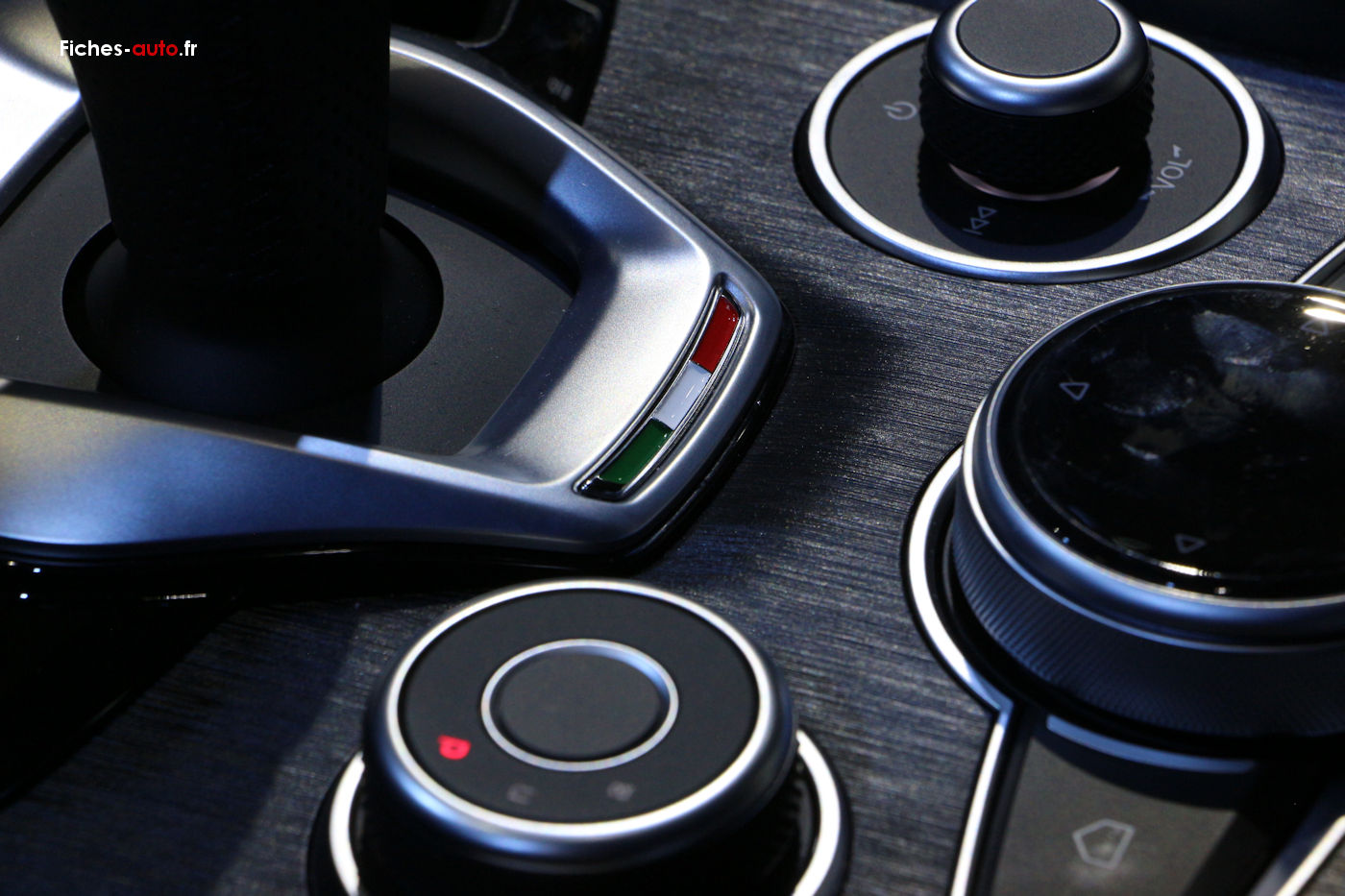 L'intérieur de la Giulia a évolué fin 2019 afin de rester un minimum compétitive en terme d'infodivertissement. C'est en effet lui qui a le plus évolué avec l'apparition d'un écran plus grand et tactile (ce qui n'était pas le cas avant). Le système est aussi plus moderne avec une ergonomie et des menus qui rappellent un peu ce que l'on peut voir chez BMW. Notez aussi que la finition a été revue sur quelques aspects et notamment la console située entre les passagers avant, avec une qualité perçue qui grimpe largement !