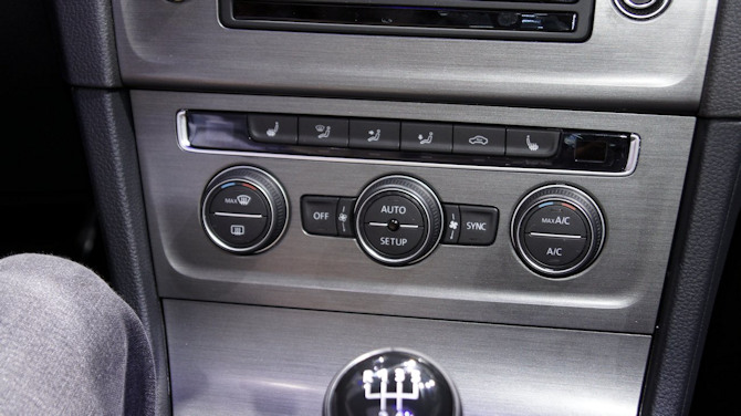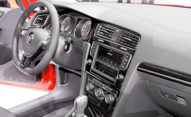 La qualité perçue à l'intérieur de l'habitacle reste surprenante pour une auto qui est censée faire partie du segment généraliste. L'intérieur s'inspire notamment de la très réussie Passat pour les matériaux (pour l'intérieur aluminium brossé car il est aussi proposé un placage noir non disponible dans la Passat), mais aussi en ce qui concerne l'instrumentation, le dessin de la console centrale et l'ergonomie. La comparaison entre les deux générations de Golf ne laisse pas de doute sur l'enrichissement du modèle. La qualité des finitions intérieur se laisse entrevoir au premier coup d'oeil : matériaux valorisants, assemblage presque chirurgical, rien n'est laissé au hasard. Cependant, la présentation reste classique, très classique à défaut d'être ringarde. L'espace à l'avant s'améliore notamment par la disparition du frein à main mécanique (il aurait été difficile de le garder en 2012, la clientèle aurait crié au scandale), remplacé par un électrique. Le levier de vitesse se voit lui rehaussé de 3 cm pour mieux tomber sous la main et le pédalier gagne en largeur. La position de conduite se trouve assez rapidement.