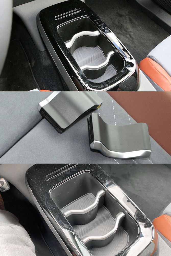 Concernant les rangements ça reste généreux avec pas mal d'emplacements au niveau de la console centrale. On profite même d'un compartiment modulable qui permet soit d'avoir une boîte carrée soit quelque chose qui peut tenir des bouteilles ou gobelets, assez astucieux.