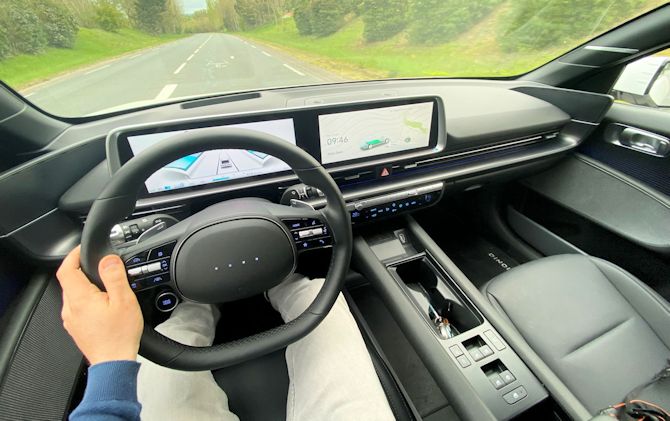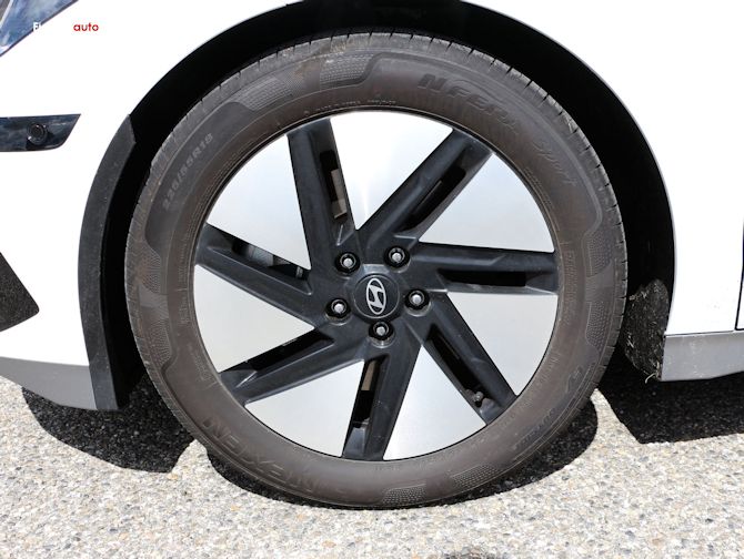 Les pneumatiques se déclinent en deux offres, avec notamment une entrée en matière basée sur du 18 pouces de 225 mm de large, ce qui me paraît trop peu pour assurer un bon grip (ce que j'ai pu constater d'ailleurs en forçant un peu). En effet, les 225 mm sont déficitaires pour tenir les deux tonnes et permettre au bon châssis de pouvoir déployer l'entièreté de ses talents. Je conseille donc vivement les 20 pouces de 245 mm de large qui sont enfin dignes de le faire avec efficacité et de mettre en valeur ce fameux châssis. Hélas le confort, déjà assez raide, perd encore des plumes ... Ces pneumatiques sont toutefois plus en accord avec les réglages châssis que les 18 pouces, qui induisent un popotin qui manque d'assurance et induit un survirage en raison de leur décrochage partiel (la Ioniq 6 enroule pas mal les virages ainsi montée, mais il semble aussi que les pneus neufs sur l'auto de mon essai favorisent encore un peu plus cela, de par l'usure des pneus qui n'épousent pas encore totalement l'angle de carrossage). Avouons aussi que la qualité des pneumatiques d'origine pourrait être meilleure et qu'il y aurait possibilité de limiter un peu plus ce phénomène (vous n'imaginez pas à quel point la qualité de gomme a une influence sur le comportement).