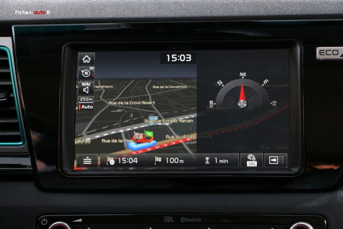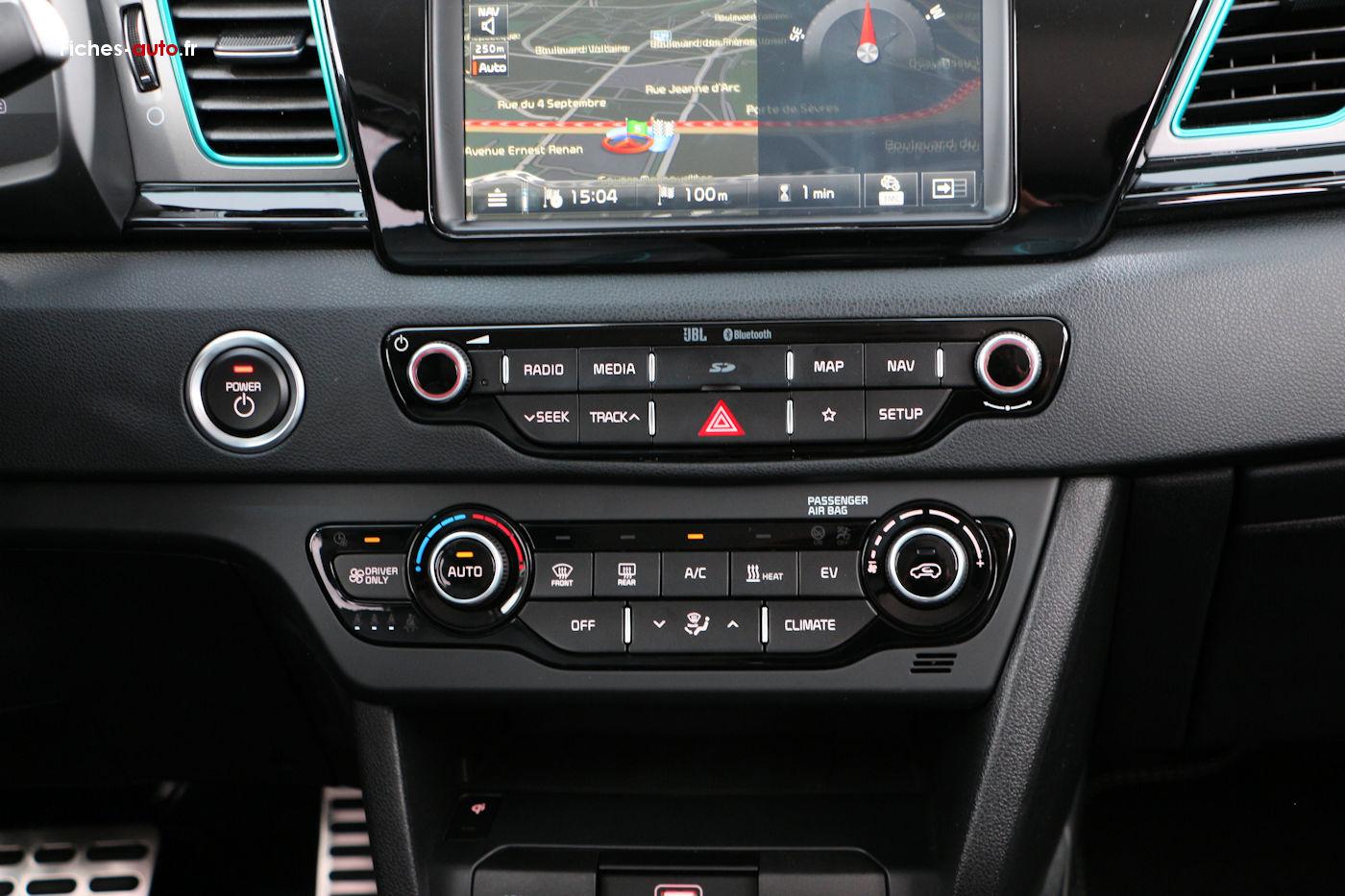 A partir de 32 990 euros : Système de freinage d’urgence autonome (AEB), Régulateur de vitesse adaptatif (SCC), Surveillance d’angles morts (BSD), Détecteur de trafic arrière (RTA), Projecteurs avant bi-Xénon, Jantes en alliage 18 pouces, Ouverture et démarrage sans clé « Smart Key », Système de chargement du smartphone par induction (nécessite un téléphone compatible), Lève-vitre passager électrique, séquentiel et anti-pincement, Radars de parking avant, Système audio premium JBL® comprenant 8 haut-parleurs dont 2 tweeters, un caisson de basse et un amplificateur externe (320 W), Système de navigation, écran tactile couleur 8’’, cartographie, Europe, fonction ECO, mise à jour de la cartographie pendant 7 ans et services connectés TomTom LIVE®(1) pendant 7 ans et compatibilité Android Auto™, Pédalier et repose-pied finition aluminium, Seuils de portes finition aluminium badgés « Niro », Sellerie cuir noir tendu et perforé, Poche aumônière au dos du siège conducteur, Siège conducteur à réglage lombaires électrique, Siège conducteur à réglages électriques, Sièges avant chauffants, Volant chauffant