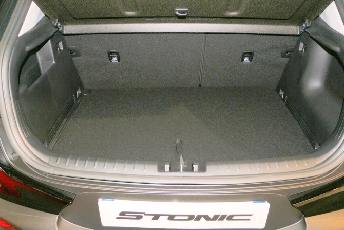 Commençons tout d'abord par le coffre, et là il faut avouer qu'on est dans la moyenne basse avec ses 352 litres de contenance. Notez donc que ce volume ne prend pas en compte la partie supérieure au dessus de la tablette, et qu'on peut donc grimper bien plus si on se permet de charger au delà. Car contrairement à un Juke qui a une poupe tombante, le Stonic garde une certaine verticalité qui permet donc d'avoir un espace relativement intéressant au dessus de la plage arrière.