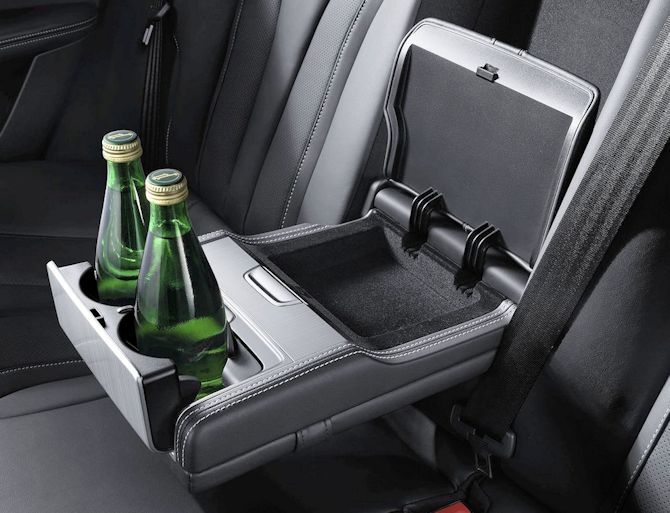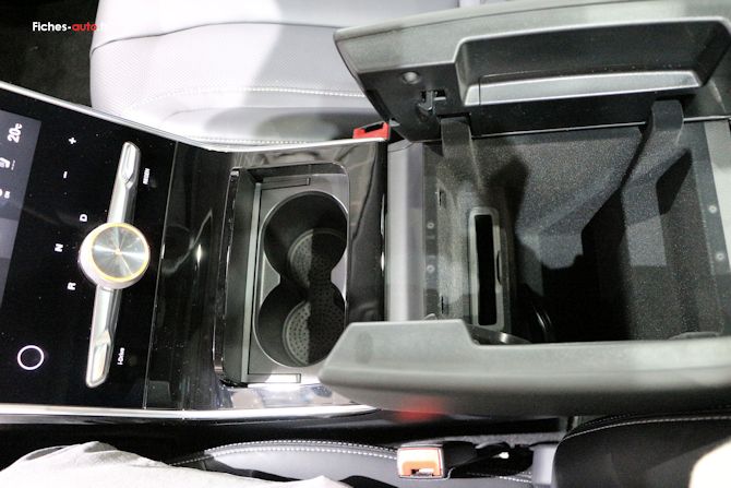 Juste devant la tablette il y a un rangement obturable qui dissimule des porte-gobelets (pas moyen de les moduler en rangement rectangulaire classique comme n peut voir chez Volkswagen par exemple). Juste derrière se trouve un accoudoir de taille respectable qui peut accueillir de manière verticale votre smartphone.