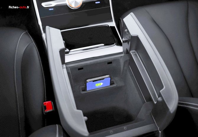 Sous la tablette très inclinée on retrouve un rangement vaste qui s'avère naturellement caché, enfin dans une certaine mesure car on peut apercevoir ce qui s'y trouve depuis l'extérieur si on a un oeil insistant. ici se trouve une charge à induction très pratique, à part dans le fait qu'on ne voir plus le téléphone (et en général on aime avoir l'oeil sur cet objet ...).