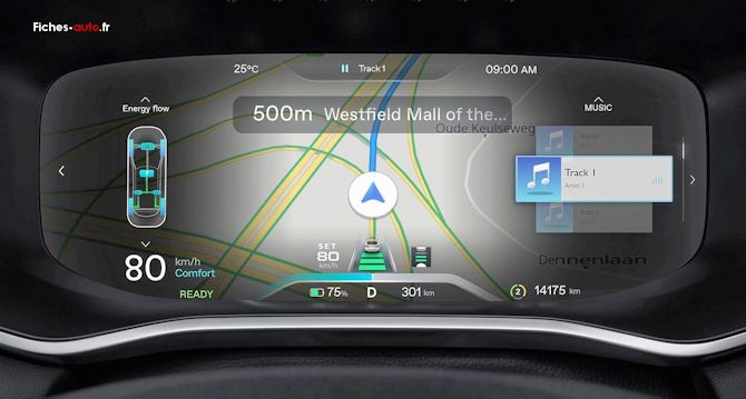 Que ce soit au niveau de la présentation ou de la qualité de finition, le fameux effet Wahou est bel et bien au rendez-vous (il ne faut pas trop regarder le volant toutefois, il fait un peu dépassé par rapport au reste). Il y a tout d'abord cette tablette XXL (on y revient plus bas) très inclinée qui confère une ambiance façon vaisseau spatial. Et si ça paraît intrusif, en réalité ça se vit assez bien et on est content qu'elle se situe pile poil sous la main, car son positionnement revient à la placer sous votre avant bras (donc ergonomique). Hélas, cette dernière est trop peu sensible aux touchers de doigts (désolé pour l'expression bancale), et il faut parfois insister vraiment pour que la commande soit prise en compte (il semble que cela a été fait pour limiter les "clics" involontaires, mais là c'est semble-t-il allé trop loin car on finit parfois par avoir du mal à bien se faire "entendre" par la machine, et il faut alors appuyer avec insistance).