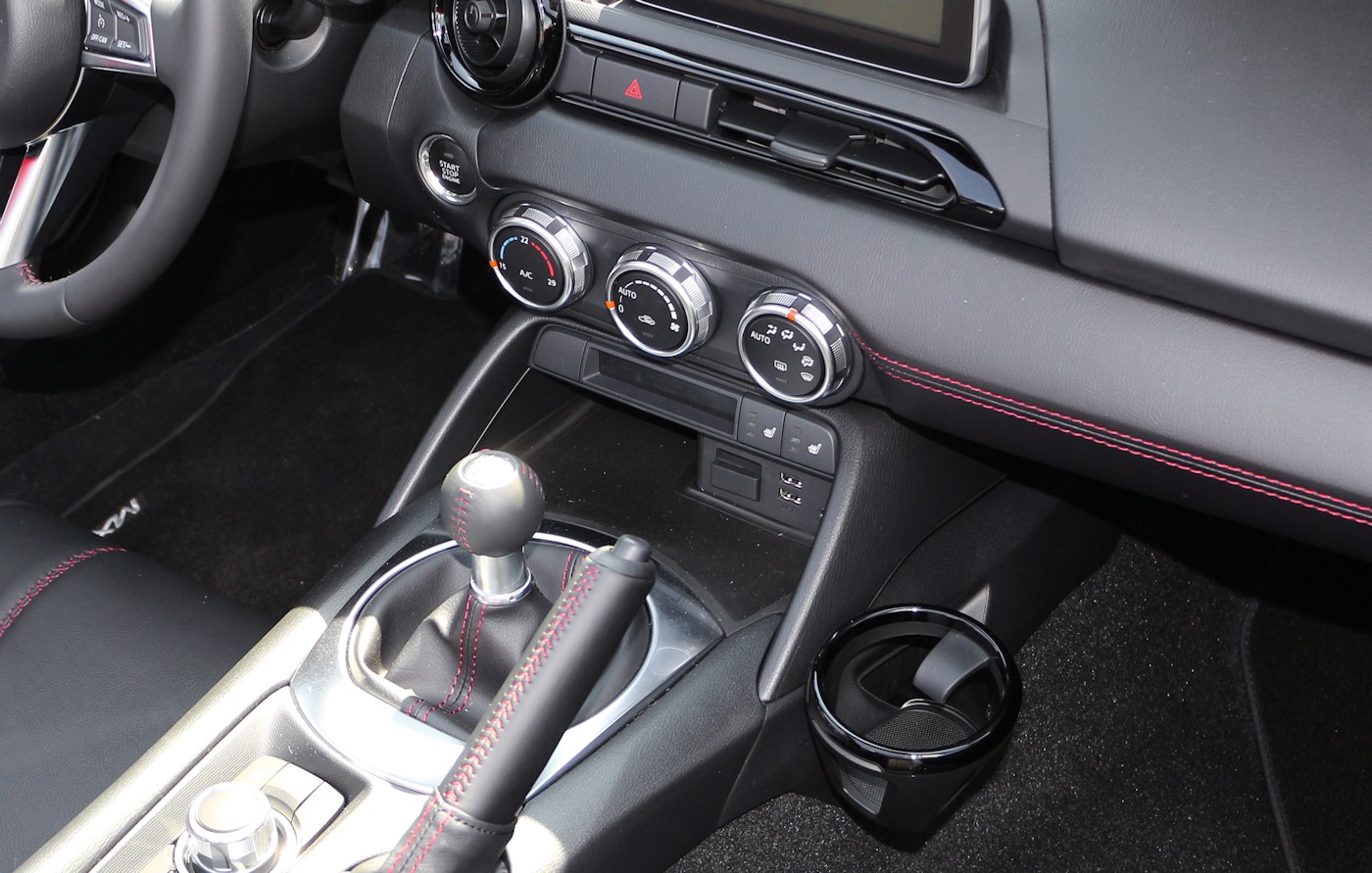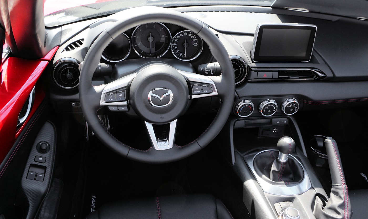 A partir de 25 500 euros : Aide au freinage d’urgence (EBA) // Airbags frontaux et latéraux // Antipatinage électronique (TCS) // Capot actif (protection des piétons) // Contrôle dynamique de stabilité (DSC) // Feux de jour à LED // Phares avant à LED // Répartiteur électronique de freinage (EBD) // Système d’antiblocage des roues au freinage (ABS) // Système d’antidémarrage // Système de signalisation d’arrêt d’urgence (ESS) // Système de surveillance de pression des pneus (TPMS) // Garnitures centrales de portes cuir vinyle noir avec surpiqûres rouges // Garnitures supérieures de portes couleur carrosserie // Jantes alliage 16" « Argent » // Poignées de portes extérieures couleur carrosserie // Poignées de portes intérieures couleur « Argent brillant » // Revêtement d’arceaux couleur « Piano Black » (sur le ST) ou couleur carrosserie (sur le RF) // Bouton d’ouverture/fermeture du toit électrique (uniquement sur RF) // Climatisation manuelle // Démarrage avec bouton « start » // Fonction « Coming/Leaving Home » // Ouverture/fermeture des portes à télécommande // Pare-soleil côtés conducteur et passager, avec miroir de courtoisie et range-ticket // Pommeau de levier de vitesses et levier de frein à main gainés de cuir // Porte-gobelets // Régulateur et limiteur de vitesse // Rétroviseurs extérieurs chauffants, couleur carrosserie et réglables électriquement // Sièges avec réglage manuel de la longueur et inclinaison // Siège conducteur avec réglage manuel de la profondeur // Sièges tissu noir avec surpiqûres rouges // Verrouillage centralisé des portes // Vitres électriques // Volant gainé de cuir avec branches couleur « Argent brillant » // Volant réglable en hauteur // Commandes au volant pour l’audio et le Bluetooth® // Ordinateur de bord avec écran couleur LCD 4,6" (sur MX-5 RF uniquement) et alarme de vitesse Radio AM/FM avec 6 haut-parleurs // Prise AUX et 2 ports USB // Système Bluetooth® // Système MZD Connect avec écran couleur 7" et interface à commandes multiples HMI